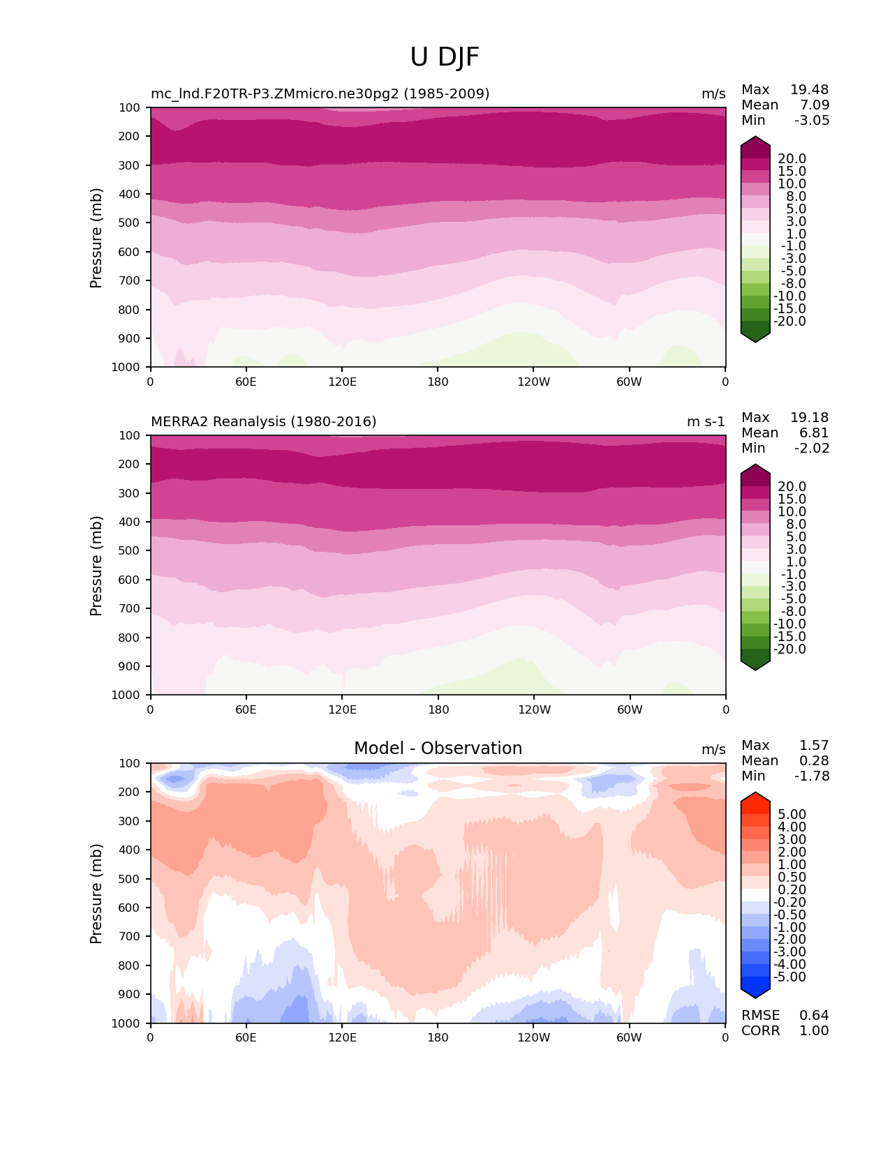 Use this command to recreate this image: | e3sm_diags meridional_mean_2d --no_viewer --case_id 'MERRA2' --sets 'meridional_mean_2d' --run_type 'model_vs_obs' --variables 'U' --seasons 'DJF' --regions 'global' --regrid_tool 'esmf' --regrid_method 'conservative' --plevs '100.0' '115.47819846894582' '133.3521432163324' '153.9926526059492' '177.82794100389228' '205.3525026457146' '237.13737056616552' '273.8419634264361' '316.22776601683796' '365.1741272548377' '421.6965034285823' '486.9675251658631' '562.341325190349' '649.3816315762114' '749.8942093324558' '865.9643233600654' '1000.0' --main_title 'U DJF' --backend 'mpl' --output_format 'png' --canvas_size_w '1212' --canvas_size_h '1628' --figsize '8.5' '11.0' --dpi '150' --arrows --contour_levels '-20' '-15' '-10' '-8' '-5' '-3' '-1' '1' '3' '5' '8' '10' '15' '20' --test_name 'mc_lnd.F20TR-P3.ZMmicro.ne30pg2' --test_title ' ' --test_colormap 'PiYG_r' --ref_name 'MERRA2' --reference_name 'MERRA2 Reanalysis' --reference_colormap 'PiYG_r' --diff_title 'Model - Observation' --diff_colormap 'diverging_bwr.rgb' --diff_levels '-5' '-4' '-3' '-2' '-1' '-0.5' '-0.2' '0.2' '0.5' '1' '2' '3' '4' '5' --num_workers '4' --granulate 'variables' 'seasons' 'regions' --selectors 'sets' 'seasons' --reference_data_path '/global/cfs/cdirs/e3sm/acme_diags/obs_for_e3sm_diags/climatology/' --test_data_path '/global/cscratch1/sd/xsongsio/E3SM_simulations/mc_lnd.F20TR-P3.ZMmicro.ne30pg2/diag/clim_rgr/25yr/' --results_dir '/global/cfs/cdirs/e3sm/www/xsongsio/mc_lnd.F20TR-P3.ZMmicro.ne30pg2/25yr' |