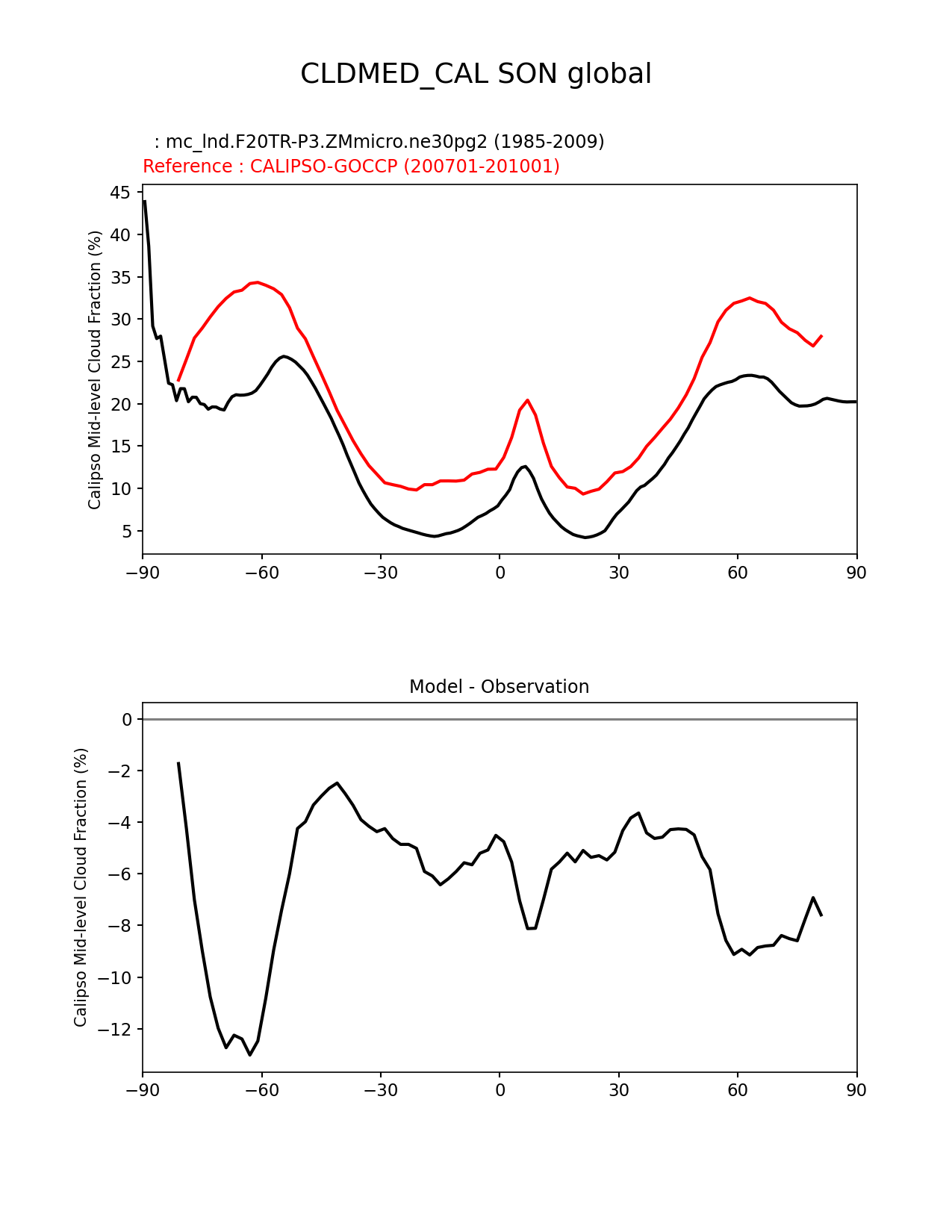 Use this command to recreate this image: | e3sm_diags zonal_mean_xy --no_viewer --case_id 'Cloud Calipso' --sets 'zonal_mean_xy' --run_type 'model_vs_obs' --variables 'CLDMED_CAL' --seasons 'SON' --regions 'global' --regrid_tool 'esmf' --regrid_method 'conservative' --main_title 'CLDMED_CAL SON global' --backend 'mpl' --output_format 'png' --canvas_size_w '1212' --canvas_size_h '1628' --figsize '8.5' '11.0' --dpi '150' --arrows --test_name 'mc_lnd.F20TR-P3.ZMmicro.ne30pg2' --test_title ' ' --test_colormap 'cet_rainbow.rgb' --ref_name 'CALIPSOCOSP' --reference_name 'CALIPSO-GOCCP' --reference_colormap 'cet_rainbow.rgb' --diff_title 'Model - Observation' --diff_colormap 'diverging_bwr.rgb' --num_workers '4' --granulate 'variables' 'seasons' 'plevs' 'regions' --selectors 'sets' 'seasons' --reference_data_path '/global/cfs/cdirs/e3sm/acme_diags/obs_for_e3sm_diags/climatology/' --test_data_path '/global/cscratch1/sd/xsongsio/E3SM_simulations/mc_lnd.F20TR-P3.ZMmicro.ne30pg2/diag/clim_rgr/25yr/' --results_dir '/global/cfs/cdirs/e3sm/www/xsongsio/mc_lnd.F20TR-P3.ZMmicro.ne30pg2/25yr' |