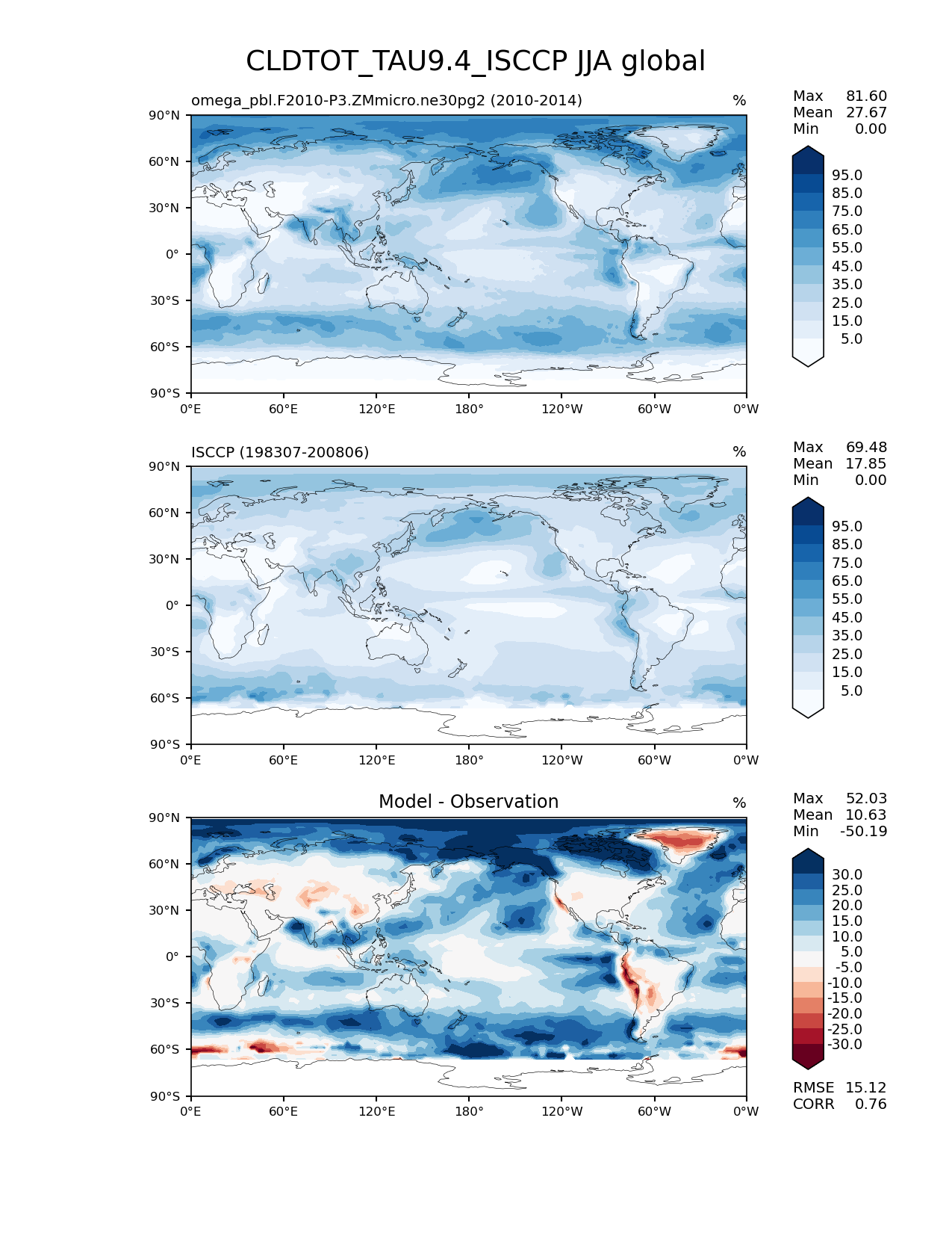 Use this command to recreate this image: | e3sm_diags lat_lon --no_viewer --case_id 'Cloud ISCCP' --sets 'lat_lon' --run_type 'model_vs_obs' --variables 'CLDTOT_TAU9.4_ISCCP' --seasons 'JJA' --regions 'global' --regrid_tool 'esmf' --regrid_method 'conservative' --main_title 'CLDTOT_TAU9.4_ISCCP JJA global' --backend 'mpl' --output_format 'png' --canvas_size_w '1212' --canvas_size_h '1628' --figsize '8.5' '11.0' --dpi '150' --arrows --contour_levels '5' '15' '25' '35' '45' '55' '65' '75' '85' '95' --test_name 'omega_pbl.F2010-P3.ZMmicro.ne30pg2' --test_title ' ' --test_colormap 'Blues' --ref_name 'ISCCPCOSP' --reference_name 'ISCCP' --reference_colormap 'Blues' --diff_title 'Model - Observation' --diff_colormap 'RdBu' --diff_levels '-30' '-25' '-20' '-15' '-10' '-5' '5' '10' '15' '20' '25' '30' --num_workers '4' --granulate 'variables' 'seasons' 'plevs' 'regions' --selectors 'sets' 'seasons' --reference_data_path '/global/cfs/cdirs/e3sm/acme_diags/obs_for_e3sm_diags/climatology/' --test_data_path '/global/cscratch1/sd/xsongsio/E3SM_simulations/omega_pbl.F2010-P3.ZMmicro.ne30pg2/diag/clim_rgr/5yr/' --results_dir '/global/cfs/cdirs/e3sm/www/xsongsio/omega_pbl.F2010-P3.ZMmicro.ne30pg2/5yr' |