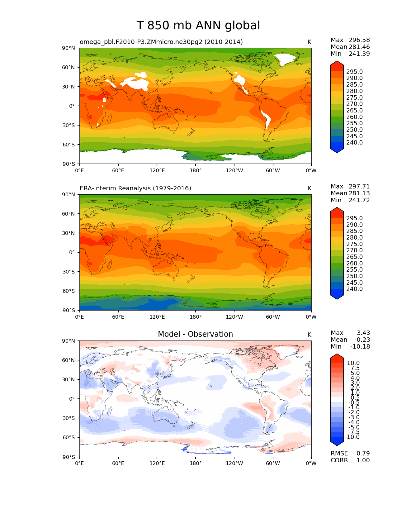 Use this command to recreate this image: | e3sm_diags lat_lon --no_viewer --case_id 'ERA-Interim' --sets 'lat_lon' --run_type 'model_vs_obs' --variables 'T' --seasons 'ANN' --regions 'global' --regrid_tool 'esmf' --regrid_method 'conservative' --plevs '850.0' --main_title 'T 850 mb ANN global' --backend 'mpl' --output_format 'png' --canvas_size_w '1212' --canvas_size_h '1628' --figsize '8.5' '11.0' --dpi '150' --arrows --contour_levels '240' '245' '250' '255' '260' '265' '270' '275' '280' '285' '290' '295' --test_name 'omega_pbl.F2010-P3.ZMmicro.ne30pg2' --test_title ' ' --test_colormap 'cet_rainbow.rgb' --ref_name 'ERA-Interim' --reference_name 'ERA-Interim Reanalysis' --reference_colormap 'cet_rainbow.rgb' --diff_title 'Model - Observation' --diff_colormap 'diverging_bwr.rgb' --diff_levels '-10' '-7.5' '-5' '-4' '-3' '-2' '-1' '-0.5' '0.5' '1' '2' '3' '4' '5' '7.5' '10' --num_workers '4' --granulate 'variables' 'seasons' 'plevs' 'regions' --selectors 'sets' 'seasons' --reference_data_path '/global/cfs/cdirs/e3sm/acme_diags/obs_for_e3sm_diags/climatology/' --test_data_path '/global/cscratch1/sd/xsongsio/E3SM_simulations/omega_pbl.F2010-P3.ZMmicro.ne30pg2/diag/clim_rgr/5yr/' --results_dir '/global/cfs/cdirs/e3sm/www/xsongsio/omega_pbl.F2010-P3.ZMmicro.ne30pg2/5yr' |