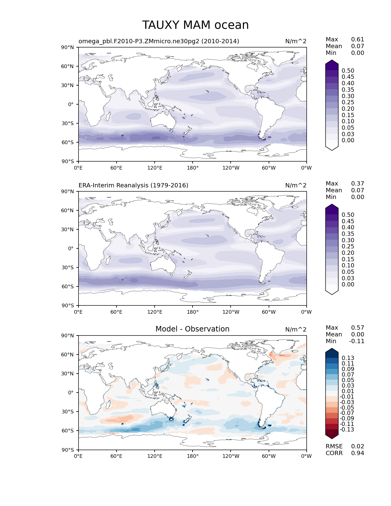 Use this command to recreate this image: | e3sm_diags lat_lon --no_viewer --case_id 'ERA-Interim' --sets 'lat_lon' --run_type 'model_vs_obs' --variables 'TAUXY' --seasons 'MAM' --regions 'ocean' --regrid_tool 'esmf' --regrid_method 'conservative' --main_title 'TAUXY MAM ocean' --backend 'mpl' --output_format 'png' --canvas_size_w '1212' --canvas_size_h '1628' --figsize '8.5' '11.0' --dpi '150' --arrows --contour_levels '0.0' '0.025' '0.05' '0.1' '0.15' '0.2' '0.25' '0.3' '0.35' '0.4' '0.45' '0.5' --test_name 'omega_pbl.F2010-P3.ZMmicro.ne30pg2' --test_title ' ' --test_colormap 'Purples' --ref_name 'ERA-Interim' --reference_name 'ERA-Interim Reanalysis' --reference_colormap 'Purples' --diff_title 'Model - Observation' --diff_colormap 'RdBu' --diff_levels '-0.13' '-0.11' '-0.09' '-0.07' '-0.05' '-0.03' '-0.01' '0.01' '0.03' '0.05' '0.07' '0.09' '0.11' '0.13' --num_workers '4' --granulate 'variables' 'seasons' 'plevs' 'regions' --selectors 'sets' 'seasons' --reference_data_path '/global/cfs/cdirs/e3sm/acme_diags/obs_for_e3sm_diags/climatology/' --test_data_path '/global/cscratch1/sd/xsongsio/E3SM_simulations/omega_pbl.F2010-P3.ZMmicro.ne30pg2/diag/clim_rgr/5yr/' --results_dir '/global/cfs/cdirs/e3sm/www/xsongsio/omega_pbl.F2010-P3.ZMmicro.ne30pg2/5yr' |