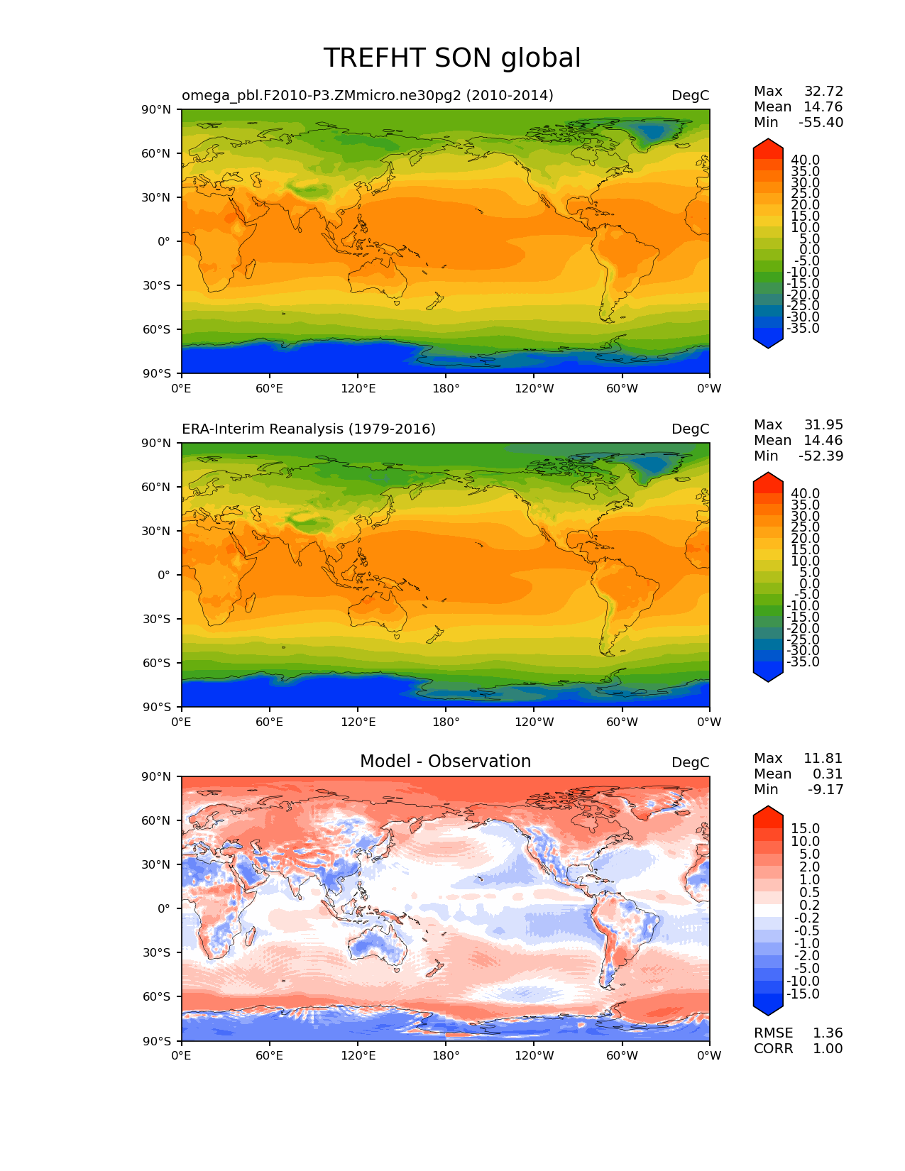 Use this command to recreate this image: | e3sm_diags lat_lon --no_viewer --case_id 'ERA-Interim' --sets 'lat_lon' --run_type 'model_vs_obs' --variables 'TREFHT' --seasons 'SON' --regions 'global' --regrid_tool 'esmf' --regrid_method 'conservative' --main_title 'TREFHT SON global' --backend 'mpl' --output_format 'png' --canvas_size_w '1212' --canvas_size_h '1628' --figsize '8.5' '11.0' --dpi '150' --arrows --contour_levels '-35' '-30' '-25' '-20' '-15' '-10' '-5' '0' '5' '10' '15' '20' '25' '30' '35' '40' --test_name 'omega_pbl.F2010-P3.ZMmicro.ne30pg2' --test_title ' ' --test_colormap 'cet_rainbow.rgb' --ref_name 'ERA-Interim' --reference_name 'ERA-Interim Reanalysis' --reference_colormap 'cet_rainbow.rgb' --diff_title 'Model - Observation' --diff_colormap 'diverging_bwr.rgb' --diff_levels '-15' '-10' '-5' '-2' '-1' '-0.5' '-0.2' '0.2' '0.5' '1' '2' '5' '10' '15' --num_workers '4' --granulate 'variables' 'seasons' 'plevs' 'regions' --selectors 'sets' 'seasons' --reference_data_path '/global/cfs/cdirs/e3sm/acme_diags/obs_for_e3sm_diags/climatology/' --test_data_path '/global/cscratch1/sd/xsongsio/E3SM_simulations/omega_pbl.F2010-P3.ZMmicro.ne30pg2/diag/clim_rgr/5yr/' --results_dir '/global/cfs/cdirs/e3sm/www/xsongsio/omega_pbl.F2010-P3.ZMmicro.ne30pg2/5yr' |