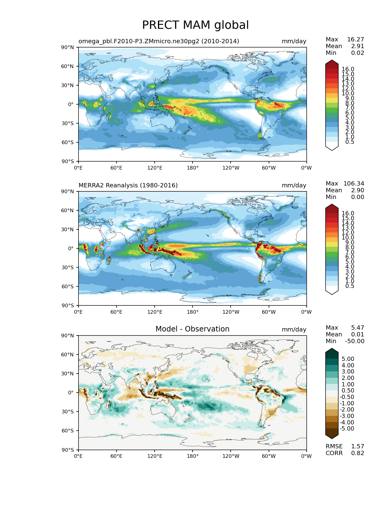 Use this command to recreate this image: | e3sm_diags lat_lon --no_viewer --case_id 'MERRA2' --sets 'lat_lon' --run_type 'model_vs_obs' --variables 'PRECT' --seasons 'MAM' --regions 'global' --regrid_tool 'esmf' --regrid_method 'conservative' --main_title 'PRECT MAM global' --backend 'mpl' --output_format 'png' --canvas_size_w '1212' --canvas_size_h '1628' --figsize '8.5' '11.0' --dpi '150' --arrows --contour_levels '0.5' '1' '2' '3' '4' '5' '6' '7' '8' '9' '10' '12' '13' '14' '15' '16' --test_name 'omega_pbl.F2010-P3.ZMmicro.ne30pg2' --test_title ' ' --test_colormap 'WhiteBlueGreenYellowRed.rgb' --ref_name 'MERRA2' --reference_name 'MERRA2 Reanalysis' --reference_colormap 'WhiteBlueGreenYellowRed.rgb' --diff_title 'Model - Observation' --diff_colormap 'BrBG' --diff_levels '-5' '-4' '-3' '-2' '-1' '-0.5' '0.5' '1' '2' '3' '4' '5' --num_workers '4' --granulate 'variables' 'seasons' 'plevs' 'regions' --selectors 'sets' 'seasons' --reference_data_path '/global/cfs/cdirs/e3sm/acme_diags/obs_for_e3sm_diags/climatology/' --test_data_path '/global/cscratch1/sd/xsongsio/E3SM_simulations/omega_pbl.F2010-P3.ZMmicro.ne30pg2/diag/clim_rgr/5yr/' --results_dir '/global/cfs/cdirs/e3sm/www/xsongsio/omega_pbl.F2010-P3.ZMmicro.ne30pg2/5yr' |