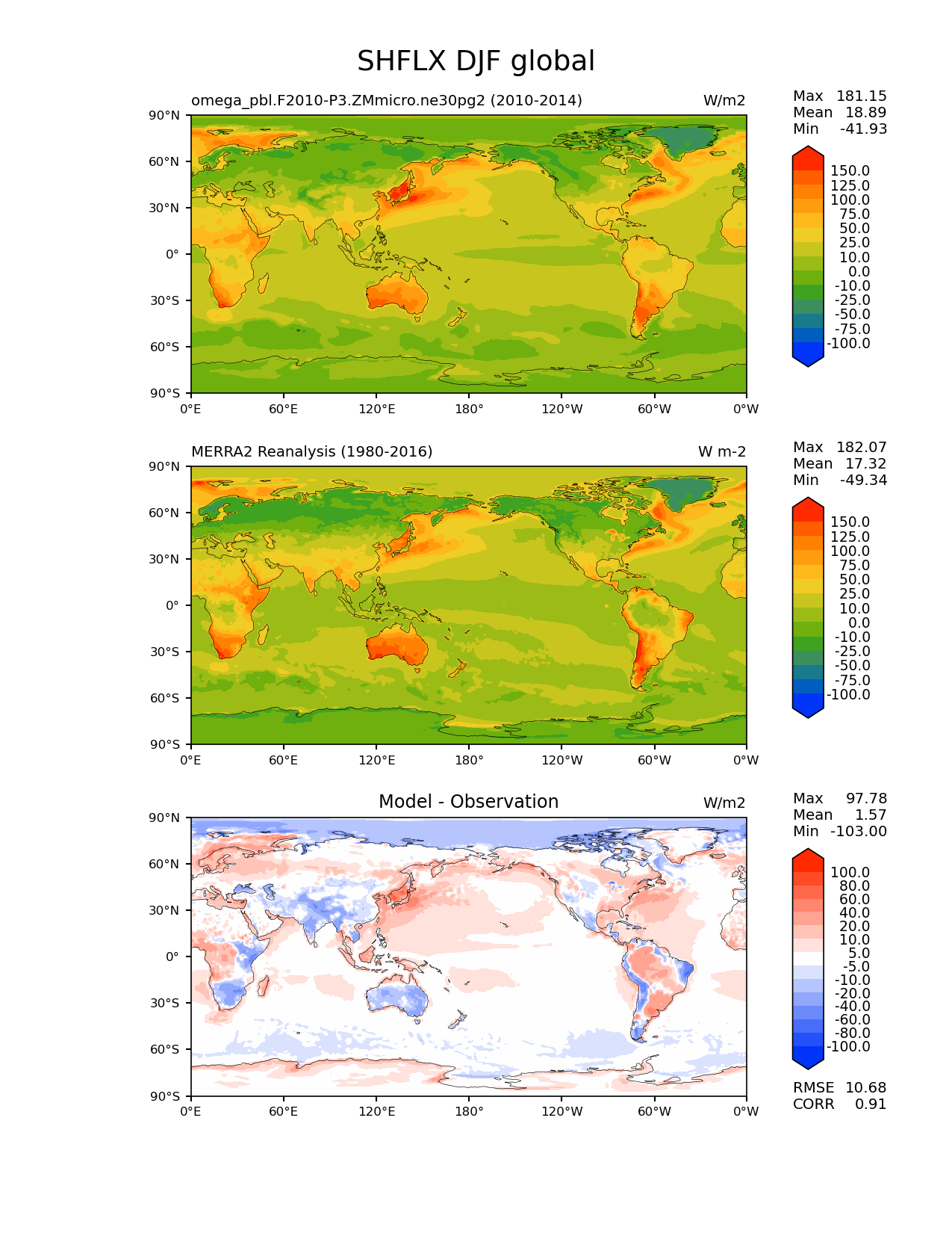 Use this command to recreate this image: | e3sm_diags lat_lon --no_viewer --case_id 'MERRA2' --sets 'lat_lon' --run_type 'model_vs_obs' --variables 'SHFLX' --seasons 'DJF' --regions 'global' --regrid_tool 'esmf' --regrid_method 'conservative' --main_title 'SHFLX DJF global' --backend 'mpl' --output_format 'png' --canvas_size_w '1212' --canvas_size_h '1628' --figsize '8.5' '11.0' --dpi '150' --arrows --contour_levels '-100' '-75' '-50' '-25' '-10' '0' '10' '25' '50' '75' '100' '125' '150' --test_name 'omega_pbl.F2010-P3.ZMmicro.ne30pg2' --test_title ' ' --test_colormap 'cet_rainbow.rgb' --ref_name 'MERRA2' --reference_name 'MERRA2 Reanalysis' --reference_colormap 'cet_rainbow.rgb' --diff_title 'Model - Observation' --diff_colormap 'diverging_bwr.rgb' --diff_levels '-100' '-80' '-60' '-40' '-20' '-10' '-5' '5' '10' '20' '40' '60' '80' '100' --num_workers '4' --granulate 'variables' 'seasons' 'plevs' 'regions' --selectors 'sets' 'seasons' --reference_data_path '/global/cfs/cdirs/e3sm/acme_diags/obs_for_e3sm_diags/climatology/' --test_data_path '/global/cscratch1/sd/xsongsio/E3SM_simulations/omega_pbl.F2010-P3.ZMmicro.ne30pg2/diag/clim_rgr/5yr/' --results_dir '/global/cfs/cdirs/e3sm/www/xsongsio/omega_pbl.F2010-P3.ZMmicro.ne30pg2/5yr' |
