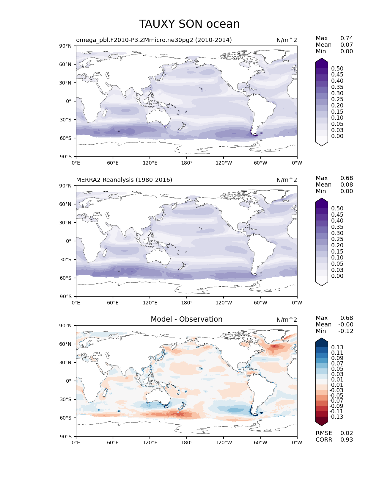Use this command to recreate this image: | e3sm_diags lat_lon --no_viewer --case_id 'MERRA2' --sets 'lat_lon' --run_type 'model_vs_obs' --variables 'TAUXY' --seasons 'SON' --regions 'ocean' --regrid_tool 'esmf' --regrid_method 'conservative' --main_title 'TAUXY SON ocean' --backend 'mpl' --output_format 'png' --canvas_size_w '1212' --canvas_size_h '1628' --figsize '8.5' '11.0' --dpi '150' --arrows --contour_levels '0.0' '0.025' '0.05' '0.1' '0.15' '0.2' '0.25' '0.3' '0.35' '0.4' '0.45' '0.5' --test_name 'omega_pbl.F2010-P3.ZMmicro.ne30pg2' --test_title ' ' --test_colormap 'Purples' --ref_name 'MERRA2' --reference_name 'MERRA2 Reanalysis' --reference_colormap 'Purples' --diff_title 'Model - Observation' --diff_colormap 'RdBu' --diff_levels '-0.13' '-0.11' '-0.09' '-0.07' '-0.05' '-0.03' '-0.01' '0.01' '0.03' '0.05' '0.07' '0.09' '0.11' '0.13' --num_workers '4' --granulate 'variables' 'seasons' 'plevs' 'regions' --selectors 'sets' 'seasons' --reference_data_path '/global/cfs/cdirs/e3sm/acme_diags/obs_for_e3sm_diags/climatology/' --test_data_path '/global/cscratch1/sd/xsongsio/E3SM_simulations/omega_pbl.F2010-P3.ZMmicro.ne30pg2/diag/clim_rgr/5yr/' --results_dir '/global/cfs/cdirs/e3sm/www/xsongsio/omega_pbl.F2010-P3.ZMmicro.ne30pg2/5yr' |