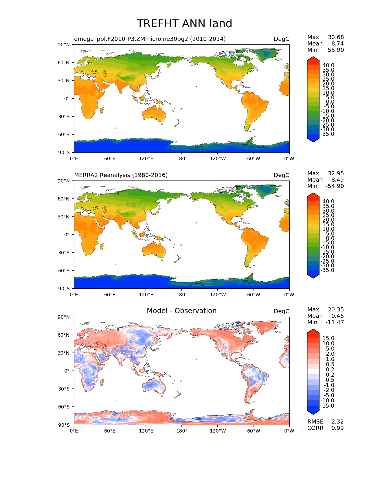 Use this command to recreate this image: | e3sm_diags lat_lon --no_viewer --case_id 'MERRA2' --sets 'lat_lon' --run_type 'model_vs_obs' --variables 'TREFHT' --seasons 'ANN' --regions 'land' --regrid_tool 'esmf' --regrid_method 'conservative' --main_title 'TREFHT ANN land' --backend 'mpl' --output_format 'png' --canvas_size_w '1212' --canvas_size_h '1628' --figsize '8.5' '11.0' --dpi '150' --arrows --contour_levels '-35' '-30' '-25' '-20' '-15' '-10' '-5' '0' '5' '10' '15' '20' '25' '30' '35' '40' --test_name 'omega_pbl.F2010-P3.ZMmicro.ne30pg2' --test_title ' ' --test_colormap 'cet_rainbow.rgb' --ref_name 'MERRA2' --reference_name 'MERRA2 Reanalysis' --reference_colormap 'cet_rainbow.rgb' --diff_title 'Model - Observation' --diff_colormap 'diverging_bwr.rgb' --diff_levels '-15' '-10' '-5' '-2' '-1' '-0.5' '-0.2' '0.2' '0.5' '1' '2' '5' '10' '15' --num_workers '4' --granulate 'variables' 'seasons' 'plevs' 'regions' --selectors 'sets' 'seasons' --reference_data_path '/global/cfs/cdirs/e3sm/acme_diags/obs_for_e3sm_diags/climatology/' --test_data_path '/global/cscratch1/sd/xsongsio/E3SM_simulations/omega_pbl.F2010-P3.ZMmicro.ne30pg2/diag/clim_rgr/5yr/' --results_dir '/global/cfs/cdirs/e3sm/www/xsongsio/omega_pbl.F2010-P3.ZMmicro.ne30pg2/5yr' |