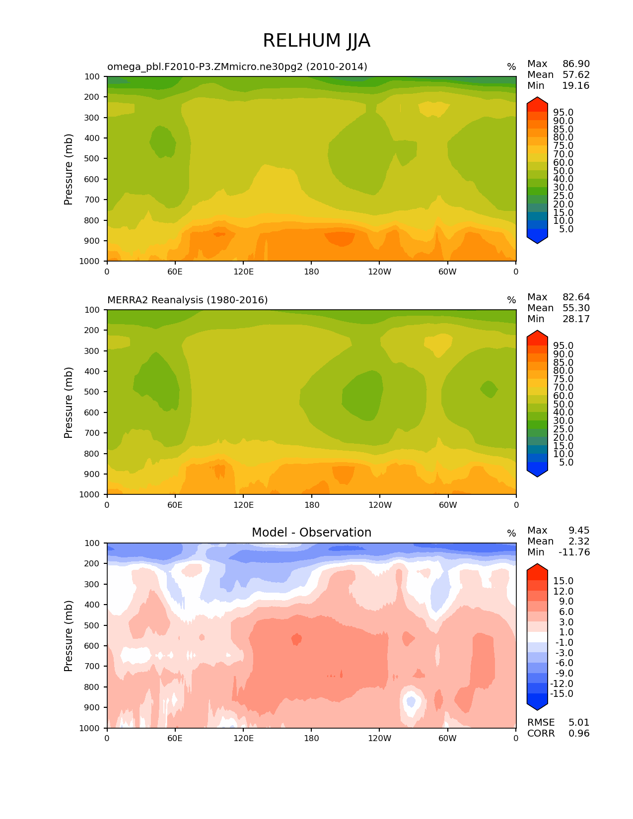 Use this command to recreate this image: | e3sm_diags meridional_mean_2d --no_viewer --case_id 'MERRA2' --sets 'meridional_mean_2d' --run_type 'model_vs_obs' --variables 'RELHUM' --seasons 'JJA' --regions 'global' --regrid_tool 'esmf' --regrid_method 'conservative' --plevs '100.0' '115.47819846894582' '133.3521432163324' '153.9926526059492' '177.82794100389228' '205.3525026457146' '237.13737056616552' '273.8419634264361' '316.22776601683796' '365.1741272548377' '421.6965034285823' '486.9675251658631' '562.341325190349' '649.3816315762114' '749.8942093324558' '865.9643233600654' '1000.0' --main_title 'RELHUM JJA' --backend 'mpl' --output_format 'png' --canvas_size_w '1212' --canvas_size_h '1628' --figsize '8.5' '11.0' --dpi '150' --arrows --contour_levels '5' '10' '15' '20' '25' '30' '40' '50' '60' '70' '75' '80' '85' '90' '95' --test_name 'omega_pbl.F2010-P3.ZMmicro.ne30pg2' --test_title ' ' --test_colormap 'cet_rainbow.rgb' --ref_name 'MERRA2' --reference_name 'MERRA2 Reanalysis' --reference_colormap 'cet_rainbow.rgb' --diff_title 'Model - Observation' --diff_colormap 'diverging_bwr.rgb' --diff_levels '-15' '-12' '-9' '-6' '-3' '-1' '1' '3' '6' '9' '12' '15' --num_workers '4' --granulate 'variables' 'seasons' 'regions' --selectors 'sets' 'seasons' --reference_data_path '/global/cfs/cdirs/e3sm/acme_diags/obs_for_e3sm_diags/climatology/' --test_data_path '/global/cscratch1/sd/xsongsio/E3SM_simulations/omega_pbl.F2010-P3.ZMmicro.ne30pg2/diag/clim_rgr/5yr/' --results_dir '/global/cfs/cdirs/e3sm/www/xsongsio/omega_pbl.F2010-P3.ZMmicro.ne30pg2/5yr' |