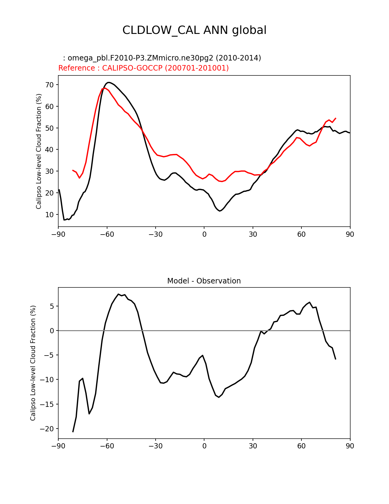 Use this command to recreate this image: | e3sm_diags zonal_mean_xy --no_viewer --case_id 'Cloud Calipso' --sets 'zonal_mean_xy' --run_type 'model_vs_obs' --variables 'CLDLOW_CAL' --seasons 'ANN' --regions 'global' --regrid_tool 'esmf' --regrid_method 'conservative' --main_title 'CLDLOW_CAL ANN global' --backend 'mpl' --output_format 'png' --canvas_size_w '1212' --canvas_size_h '1628' --figsize '8.5' '11.0' --dpi '150' --arrows --test_name 'omega_pbl.F2010-P3.ZMmicro.ne30pg2' --test_title ' ' --test_colormap 'cet_rainbow.rgb' --ref_name 'CALIPSOCOSP' --reference_name 'CALIPSO-GOCCP' --reference_colormap 'cet_rainbow.rgb' --diff_title 'Model - Observation' --diff_colormap 'diverging_bwr.rgb' --num_workers '4' --granulate 'variables' 'seasons' 'plevs' 'regions' --selectors 'sets' 'seasons' --reference_data_path '/global/cfs/cdirs/e3sm/acme_diags/obs_for_e3sm_diags/climatology/' --test_data_path '/global/cscratch1/sd/xsongsio/E3SM_simulations/omega_pbl.F2010-P3.ZMmicro.ne30pg2/diag/clim_rgr/5yr/' --results_dir '/global/cfs/cdirs/e3sm/www/xsongsio/omega_pbl.F2010-P3.ZMmicro.ne30pg2/5yr' |