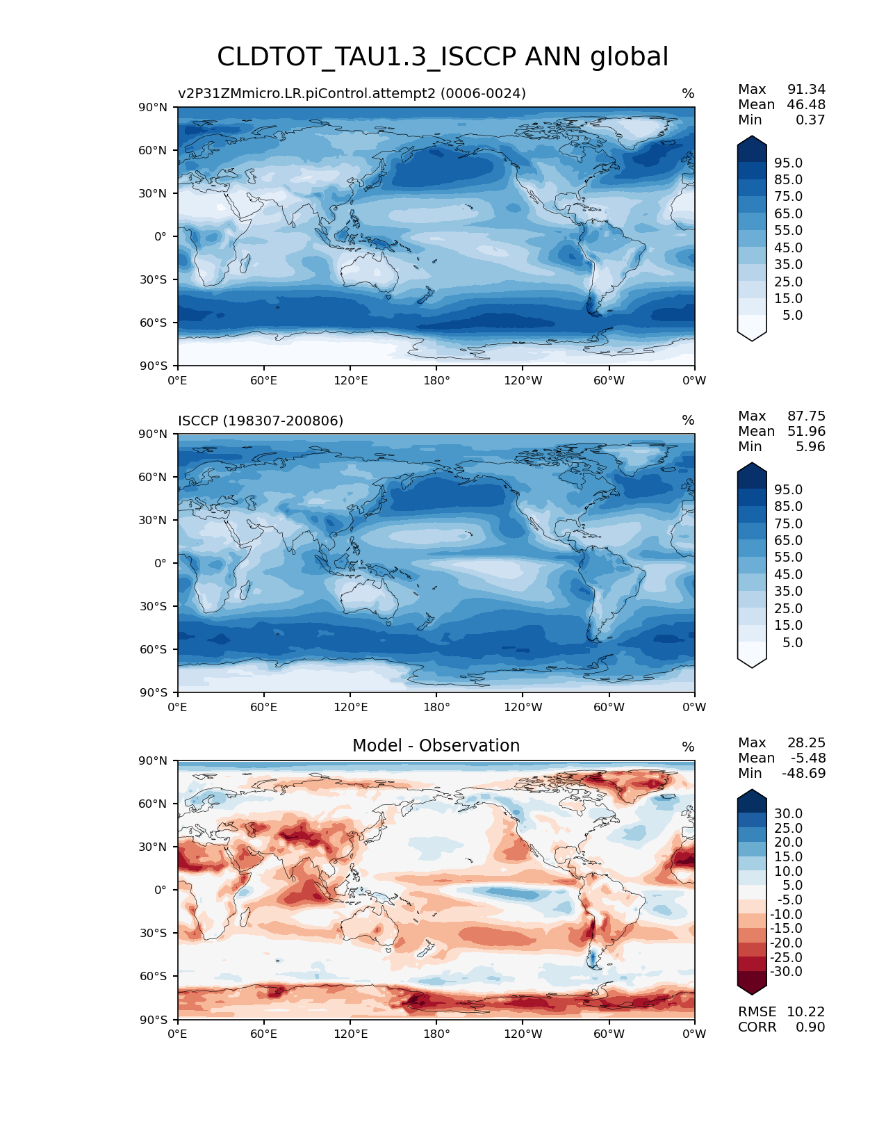 Use this command to recreate this image: | e3sm_diags lat_lon --no_viewer --case_id 'Cloud ISCCP' --sets 'lat_lon' --run_type 'model_vs_obs' --variables 'CLDTOT_TAU1.3_ISCCP' --seasons 'ANN' --regions 'global' --regrid_tool 'esmf' --regrid_method 'conservative' --main_title 'CLDTOT_TAU1.3_ISCCP ANN global' --backend 'mpl' --output_format 'png' --canvas_size_w '1212' --canvas_size_h '1628' --figsize '8.5' '11.0' --dpi '150' --arrows --contour_levels '5' '15' '25' '35' '45' '55' '65' '75' '85' '95' --test_name 'v2P31ZMmicro.LR.piControl.attempt2' --test_title ' ' --test_colormap 'Blues' --ref_name 'ISCCPCOSP' --reference_name 'ISCCP' --reference_colormap 'Blues' --diff_title 'Model - Observation' --diff_colormap 'RdBu' --diff_levels '-30' '-25' '-20' '-15' '-10' '-5' '5' '10' '15' '20' '25' '30' --num_workers '4' --granulate 'variables' 'seasons' 'plevs' 'regions' --selectors 'sets' 'seasons' --reference_data_path '/global/cfs/cdirs/e3sm/acme_diags/obs_for_e3sm_diags/climatology/' --test_data_path '/global/cscratch1/sd/xsongsio/DATA/E3SM2_P3/v2P31ZMmicro.LR.piControl/diag/clim_rgr/19yr/' --results_dir '/global/cfs/cdirs/e3sm/www/xsongsio/v2P31ZMmicro.LR.piControl.attempt2/19yr' |