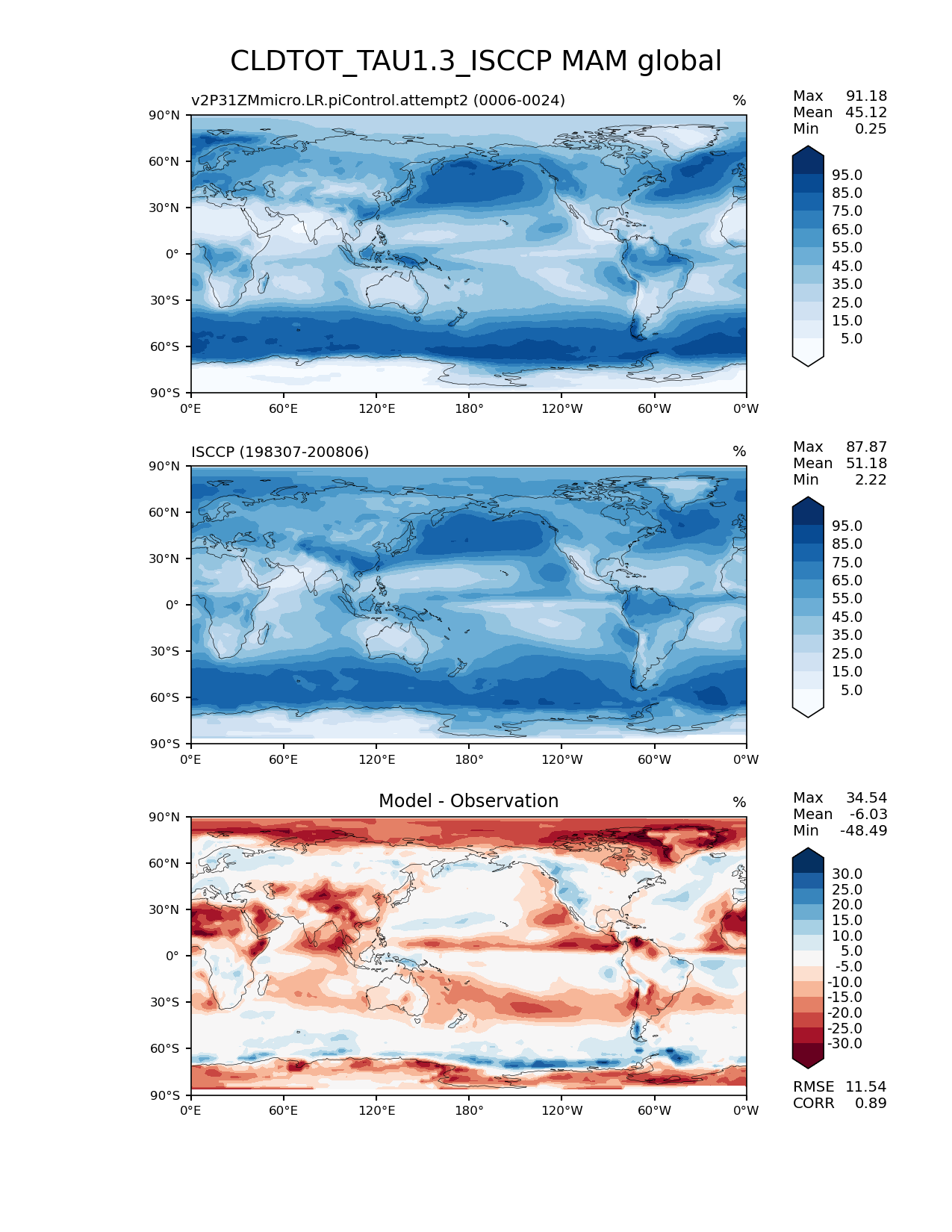 Use this command to recreate this image: | e3sm_diags lat_lon --no_viewer --case_id 'Cloud ISCCP' --sets 'lat_lon' --run_type 'model_vs_obs' --variables 'CLDTOT_TAU1.3_ISCCP' --seasons 'MAM' --regions 'global' --regrid_tool 'esmf' --regrid_method 'conservative' --main_title 'CLDTOT_TAU1.3_ISCCP MAM global' --backend 'mpl' --output_format 'png' --canvas_size_w '1212' --canvas_size_h '1628' --figsize '8.5' '11.0' --dpi '150' --arrows --contour_levels '5' '15' '25' '35' '45' '55' '65' '75' '85' '95' --test_name 'v2P31ZMmicro.LR.piControl.attempt2' --test_title ' ' --test_colormap 'Blues' --ref_name 'ISCCPCOSP' --reference_name 'ISCCP' --reference_colormap 'Blues' --diff_title 'Model - Observation' --diff_colormap 'RdBu' --diff_levels '-30' '-25' '-20' '-15' '-10' '-5' '5' '10' '15' '20' '25' '30' --num_workers '4' --granulate 'variables' 'seasons' 'plevs' 'regions' --selectors 'sets' 'seasons' --reference_data_path '/global/cfs/cdirs/e3sm/acme_diags/obs_for_e3sm_diags/climatology/' --test_data_path '/global/cscratch1/sd/xsongsio/DATA/E3SM2_P3/v2P31ZMmicro.LR.piControl/diag/clim_rgr/19yr/' --results_dir '/global/cfs/cdirs/e3sm/www/xsongsio/v2P31ZMmicro.LR.piControl.attempt2/19yr' |