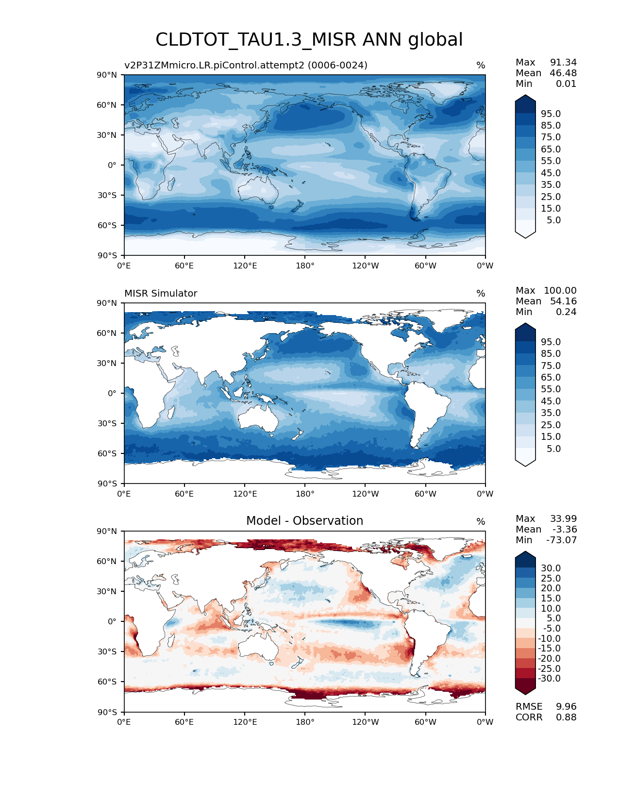 Use this command to recreate this image: | e3sm_diags lat_lon --no_viewer --case_id 'Cloud MISR' --sets 'lat_lon' --run_type 'model_vs_obs' --variables 'CLDTOT_TAU1.3_MISR' --seasons 'ANN' --regions 'global' --regrid_tool 'esmf' --regrid_method 'conservative' --main_title 'CLDTOT_TAU1.3_MISR ANN global' --backend 'mpl' --output_format 'png' --canvas_size_w '1212' --canvas_size_h '1628' --figsize '8.5' '11.0' --dpi '150' --arrows --contour_levels '5' '15' '25' '35' '45' '55' '65' '75' '85' '95' --test_name 'v2P31ZMmicro.LR.piControl.attempt2' --test_title ' ' --test_colormap 'Blues' --ref_name 'MISRCOSP' --reference_name 'MISR Simulator' --reference_colormap 'Blues' --diff_title 'Model - Observation' --diff_colormap 'RdBu' --diff_levels '-30' '-25' '-20' '-15' '-10' '-5' '5' '10' '15' '20' '25' '30' --num_workers '4' --granulate 'variables' 'seasons' 'plevs' 'regions' --selectors 'sets' 'seasons' --reference_data_path '/global/cfs/cdirs/e3sm/acme_diags/obs_for_e3sm_diags/climatology/' --test_data_path '/global/cscratch1/sd/xsongsio/DATA/E3SM2_P3/v2P31ZMmicro.LR.piControl/diag/clim_rgr/19yr/' --results_dir '/global/cfs/cdirs/e3sm/www/xsongsio/v2P31ZMmicro.LR.piControl.attempt2/19yr' |