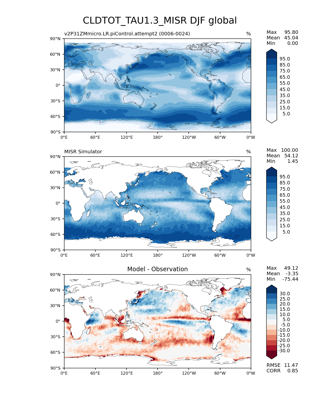 Use this command to recreate this image: | e3sm_diags lat_lon --no_viewer --case_id 'Cloud MISR' --sets 'lat_lon' --run_type 'model_vs_obs' --variables 'CLDTOT_TAU1.3_MISR' --seasons 'DJF' --regions 'global' --regrid_tool 'esmf' --regrid_method 'conservative' --main_title 'CLDTOT_TAU1.3_MISR DJF global' --backend 'mpl' --output_format 'png' --canvas_size_w '1212' --canvas_size_h '1628' --figsize '8.5' '11.0' --dpi '150' --arrows --contour_levels '5' '15' '25' '35' '45' '55' '65' '75' '85' '95' --test_name 'v2P31ZMmicro.LR.piControl.attempt2' --test_title ' ' --test_colormap 'Blues' --ref_name 'MISRCOSP' --reference_name 'MISR Simulator' --reference_colormap 'Blues' --diff_title 'Model - Observation' --diff_colormap 'RdBu' --diff_levels '-30' '-25' '-20' '-15' '-10' '-5' '5' '10' '15' '20' '25' '30' --num_workers '4' --granulate 'variables' 'seasons' 'plevs' 'regions' --selectors 'sets' 'seasons' --reference_data_path '/global/cfs/cdirs/e3sm/acme_diags/obs_for_e3sm_diags/climatology/' --test_data_path '/global/cscratch1/sd/xsongsio/DATA/E3SM2_P3/v2P31ZMmicro.LR.piControl/diag/clim_rgr/19yr/' --results_dir '/global/cfs/cdirs/e3sm/www/xsongsio/v2P31ZMmicro.LR.piControl.attempt2/19yr' |