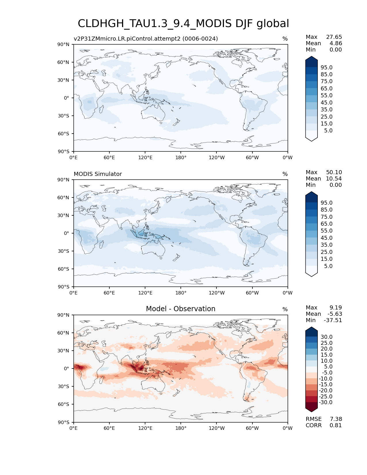 Use this command to recreate this image: | e3sm_diags lat_lon --no_viewer --case_id 'Cloud MODIS' --sets 'lat_lon' --run_type 'model_vs_obs' --variables 'CLDHGH_TAU1.3_9.4_MODIS' --seasons 'DJF' --regions 'global' --regrid_tool 'esmf' --regrid_method 'conservative' --main_title 'CLDHGH_TAU1.3_9.4_MODIS DJF global' --backend 'mpl' --output_format 'png' --canvas_size_w '1212' --canvas_size_h '1628' --figsize '8.5' '11.0' --dpi '150' --arrows --contour_levels '5' '15' '25' '35' '45' '55' '65' '75' '85' '95' --test_name 'v2P31ZMmicro.LR.piControl.attempt2' --test_title ' ' --test_colormap 'Blues' --ref_name 'MODISCOSP' --reference_name 'MODIS Simulator' --reference_colormap 'Blues' --diff_title 'Model - Observation' --diff_colormap 'RdBu' --diff_levels '-30' '-25' '-20' '-15' '-10' '-5' '5' '10' '15' '20' '25' '30' --num_workers '4' --granulate 'variables' 'seasons' 'plevs' 'regions' --selectors 'sets' 'seasons' --reference_data_path '/global/cfs/cdirs/e3sm/acme_diags/obs_for_e3sm_diags/climatology/' --test_data_path '/global/cscratch1/sd/xsongsio/DATA/E3SM2_P3/v2P31ZMmicro.LR.piControl/diag/clim_rgr/19yr/' --results_dir '/global/cfs/cdirs/e3sm/www/xsongsio/v2P31ZMmicro.LR.piControl.attempt2/19yr' |