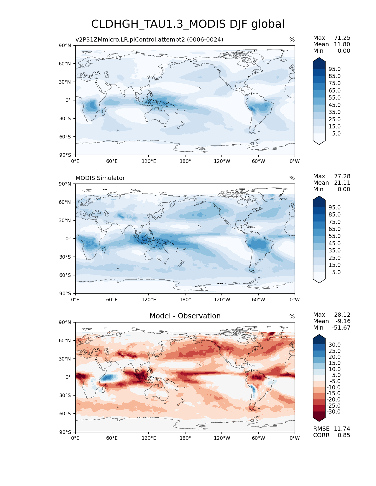 Use this command to recreate this image: | e3sm_diags lat_lon --no_viewer --case_id 'Cloud MODIS' --sets 'lat_lon' --run_type 'model_vs_obs' --variables 'CLDHGH_TAU1.3_MODIS' --seasons 'DJF' --regions 'global' --regrid_tool 'esmf' --regrid_method 'conservative' --main_title 'CLDHGH_TAU1.3_MODIS DJF global' --backend 'mpl' --output_format 'png' --canvas_size_w '1212' --canvas_size_h '1628' --figsize '8.5' '11.0' --dpi '150' --arrows --contour_levels '5' '15' '25' '35' '45' '55' '65' '75' '85' '95' --test_name 'v2P31ZMmicro.LR.piControl.attempt2' --test_title ' ' --test_colormap 'Blues' --ref_name 'MODISCOSP' --reference_name 'MODIS Simulator' --reference_colormap 'Blues' --diff_title 'Model - Observation' --diff_colormap 'RdBu' --diff_levels '-30' '-25' '-20' '-15' '-10' '-5' '5' '10' '15' '20' '25' '30' --num_workers '4' --granulate 'variables' 'seasons' 'plevs' 'regions' --selectors 'sets' 'seasons' --reference_data_path '/global/cfs/cdirs/e3sm/acme_diags/obs_for_e3sm_diags/climatology/' --test_data_path '/global/cscratch1/sd/xsongsio/DATA/E3SM2_P3/v2P31ZMmicro.LR.piControl/diag/clim_rgr/19yr/' --results_dir '/global/cfs/cdirs/e3sm/www/xsongsio/v2P31ZMmicro.LR.piControl.attempt2/19yr' |