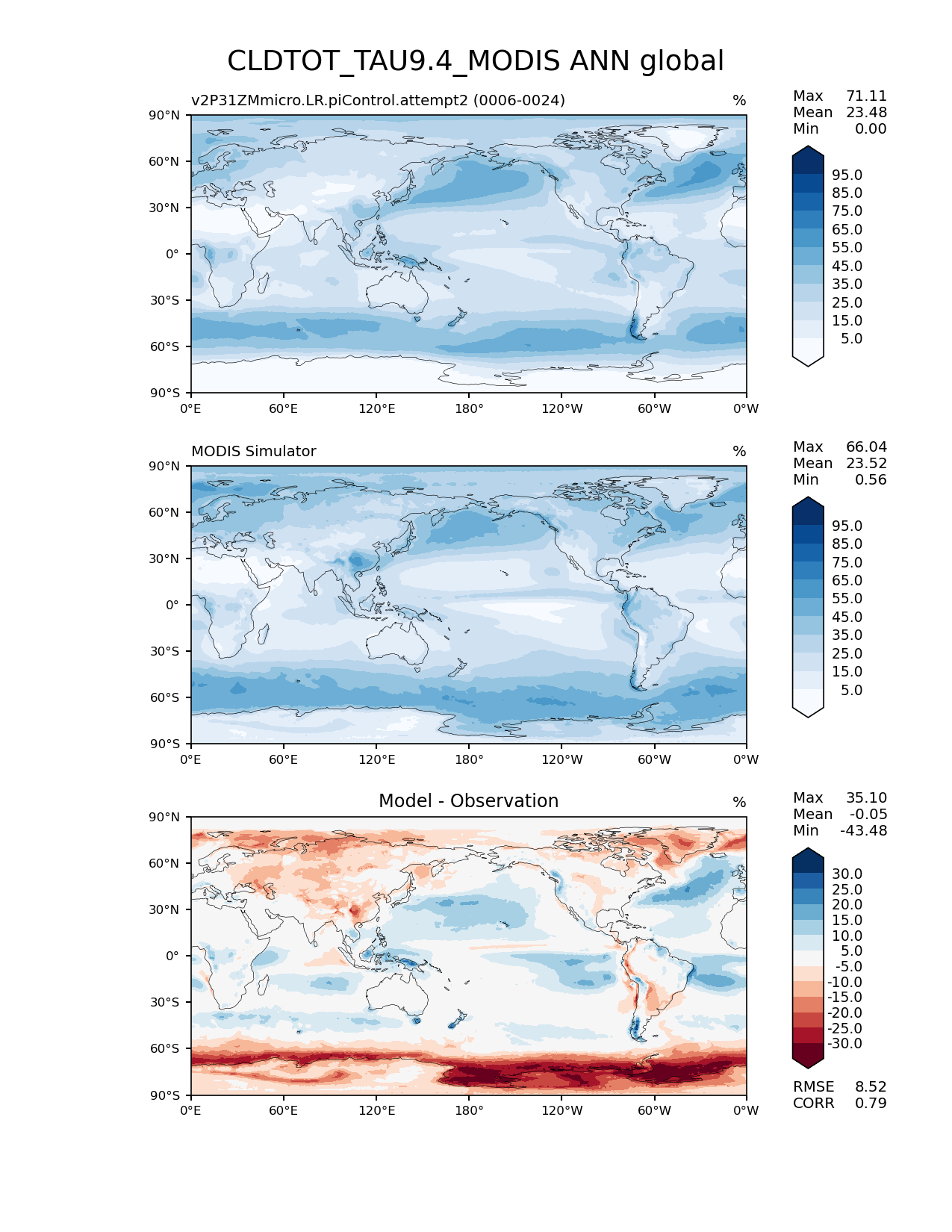 Use this command to recreate this image: | e3sm_diags lat_lon --no_viewer --case_id 'Cloud MODIS' --sets 'lat_lon' --run_type 'model_vs_obs' --variables 'CLDTOT_TAU9.4_MODIS' --seasons 'ANN' --regions 'global' --regrid_tool 'esmf' --regrid_method 'conservative' --main_title 'CLDTOT_TAU9.4_MODIS ANN global' --backend 'mpl' --output_format 'png' --canvas_size_w '1212' --canvas_size_h '1628' --figsize '8.5' '11.0' --dpi '150' --arrows --contour_levels '5' '15' '25' '35' '45' '55' '65' '75' '85' '95' --test_name 'v2P31ZMmicro.LR.piControl.attempt2' --test_title ' ' --test_colormap 'Blues' --ref_name 'MODISCOSP' --reference_name 'MODIS Simulator' --reference_colormap 'Blues' --diff_title 'Model - Observation' --diff_colormap 'RdBu' --diff_levels '-30' '-25' '-20' '-15' '-10' '-5' '5' '10' '15' '20' '25' '30' --num_workers '4' --granulate 'variables' 'seasons' 'plevs' 'regions' --selectors 'sets' 'seasons' --reference_data_path '/global/cfs/cdirs/e3sm/acme_diags/obs_for_e3sm_diags/climatology/' --test_data_path '/global/cscratch1/sd/xsongsio/DATA/E3SM2_P3/v2P31ZMmicro.LR.piControl/diag/clim_rgr/19yr/' --results_dir '/global/cfs/cdirs/e3sm/www/xsongsio/v2P31ZMmicro.LR.piControl.attempt2/19yr' |