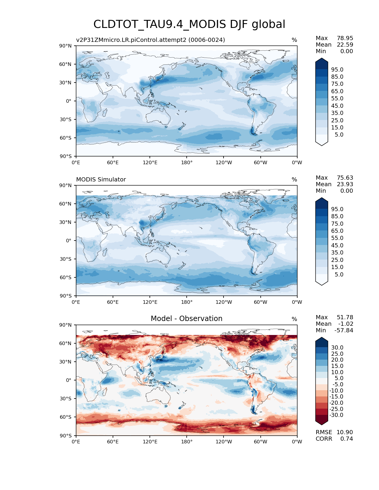 Use this command to recreate this image: | e3sm_diags lat_lon --no_viewer --case_id 'Cloud MODIS' --sets 'lat_lon' --run_type 'model_vs_obs' --variables 'CLDTOT_TAU9.4_MODIS' --seasons 'DJF' --regions 'global' --regrid_tool 'esmf' --regrid_method 'conservative' --main_title 'CLDTOT_TAU9.4_MODIS DJF global' --backend 'mpl' --output_format 'png' --canvas_size_w '1212' --canvas_size_h '1628' --figsize '8.5' '11.0' --dpi '150' --arrows --contour_levels '5' '15' '25' '35' '45' '55' '65' '75' '85' '95' --test_name 'v2P31ZMmicro.LR.piControl.attempt2' --test_title ' ' --test_colormap 'Blues' --ref_name 'MODISCOSP' --reference_name 'MODIS Simulator' --reference_colormap 'Blues' --diff_title 'Model - Observation' --diff_colormap 'RdBu' --diff_levels '-30' '-25' '-20' '-15' '-10' '-5' '5' '10' '15' '20' '25' '30' --num_workers '4' --granulate 'variables' 'seasons' 'plevs' 'regions' --selectors 'sets' 'seasons' --reference_data_path '/global/cfs/cdirs/e3sm/acme_diags/obs_for_e3sm_diags/climatology/' --test_data_path '/global/cscratch1/sd/xsongsio/DATA/E3SM2_P3/v2P31ZMmicro.LR.piControl/diag/clim_rgr/19yr/' --results_dir '/global/cfs/cdirs/e3sm/www/xsongsio/v2P31ZMmicro.LR.piControl.attempt2/19yr' |