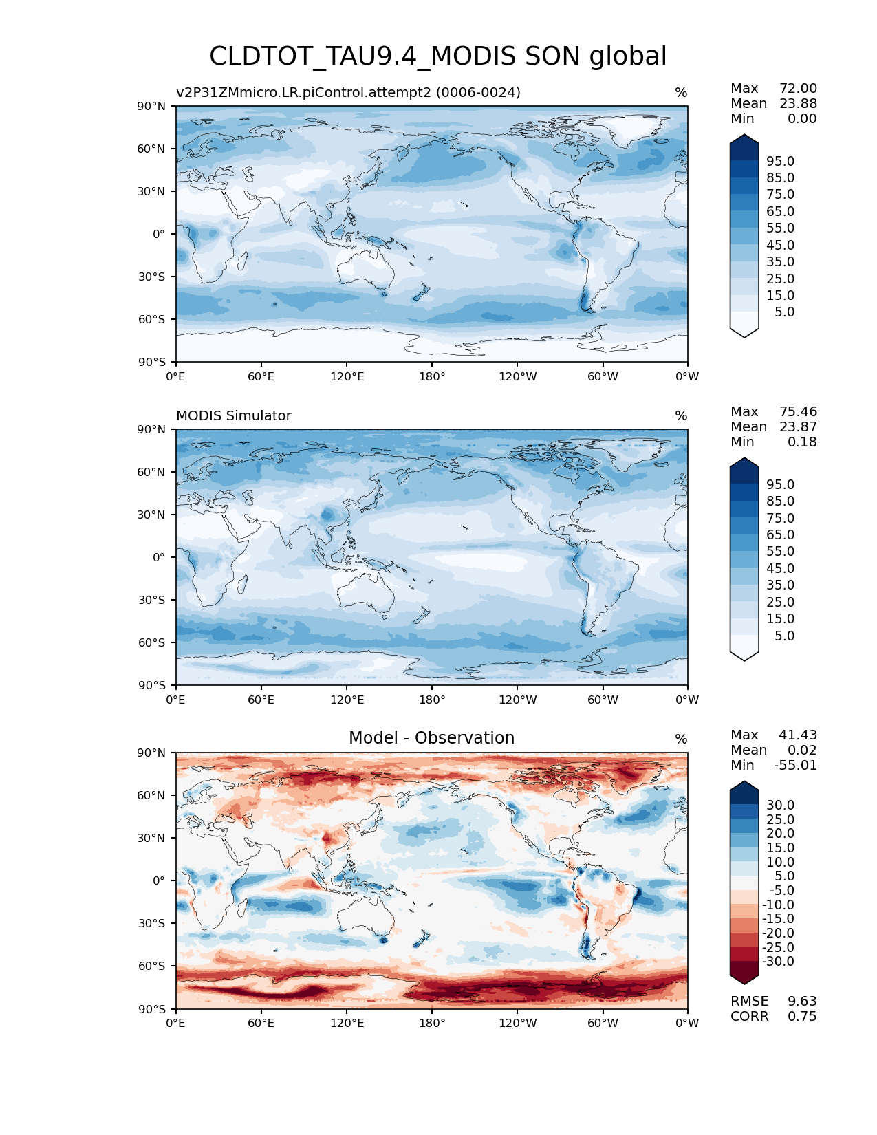 Use this command to recreate this image: | e3sm_diags lat_lon --no_viewer --case_id 'Cloud MODIS' --sets 'lat_lon' --run_type 'model_vs_obs' --variables 'CLDTOT_TAU9.4_MODIS' --seasons 'SON' --regions 'global' --regrid_tool 'esmf' --regrid_method 'conservative' --main_title 'CLDTOT_TAU9.4_MODIS SON global' --backend 'mpl' --output_format 'png' --canvas_size_w '1212' --canvas_size_h '1628' --figsize '8.5' '11.0' --dpi '150' --arrows --contour_levels '5' '15' '25' '35' '45' '55' '65' '75' '85' '95' --test_name 'v2P31ZMmicro.LR.piControl.attempt2' --test_title ' ' --test_colormap 'Blues' --ref_name 'MODISCOSP' --reference_name 'MODIS Simulator' --reference_colormap 'Blues' --diff_title 'Model - Observation' --diff_colormap 'RdBu' --diff_levels '-30' '-25' '-20' '-15' '-10' '-5' '5' '10' '15' '20' '25' '30' --num_workers '4' --granulate 'variables' 'seasons' 'plevs' 'regions' --selectors 'sets' 'seasons' --reference_data_path '/global/cfs/cdirs/e3sm/acme_diags/obs_for_e3sm_diags/climatology/' --test_data_path '/global/cscratch1/sd/xsongsio/DATA/E3SM2_P3/v2P31ZMmicro.LR.piControl/diag/clim_rgr/19yr/' --results_dir '/global/cfs/cdirs/e3sm/www/xsongsio/v2P31ZMmicro.LR.piControl.attempt2/19yr' |
