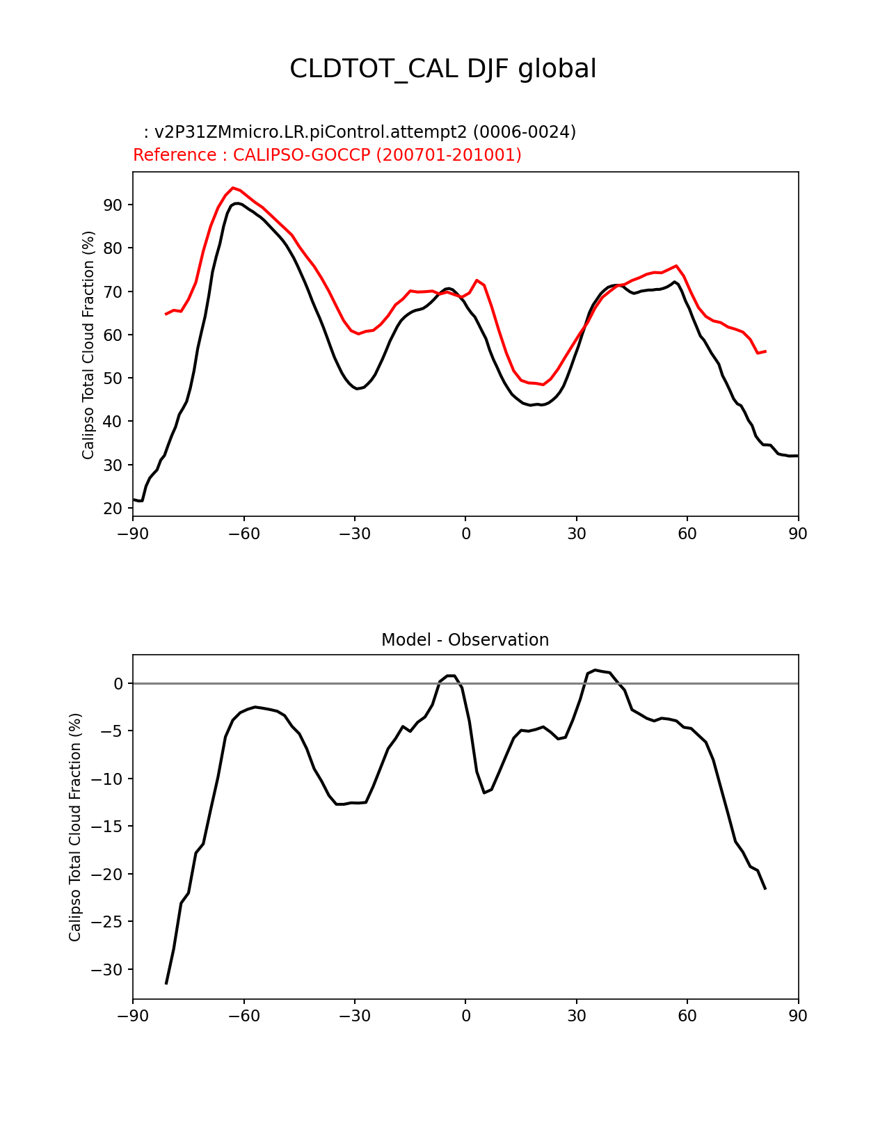 Use this command to recreate this image: | e3sm_diags zonal_mean_xy --no_viewer --case_id 'Cloud Calipso' --sets 'zonal_mean_xy' --run_type 'model_vs_obs' --variables 'CLDTOT_CAL' --seasons 'DJF' --regions 'global' --regrid_tool 'esmf' --regrid_method 'conservative' --main_title 'CLDTOT_CAL DJF global' --backend 'mpl' --output_format 'png' --canvas_size_w '1212' --canvas_size_h '1628' --figsize '8.5' '11.0' --dpi '150' --arrows --test_name 'v2P31ZMmicro.LR.piControl.attempt2' --test_title ' ' --test_colormap 'cet_rainbow.rgb' --ref_name 'CALIPSOCOSP' --reference_name 'CALIPSO-GOCCP' --reference_colormap 'cet_rainbow.rgb' --diff_title 'Model - Observation' --diff_colormap 'diverging_bwr.rgb' --num_workers '4' --granulate 'variables' 'seasons' 'plevs' 'regions' --selectors 'sets' 'seasons' --reference_data_path '/global/cfs/cdirs/e3sm/acme_diags/obs_for_e3sm_diags/climatology/' --test_data_path '/global/cscratch1/sd/xsongsio/DATA/E3SM2_P3/v2P31ZMmicro.LR.piControl/diag/clim_rgr/19yr/' --results_dir '/global/cfs/cdirs/e3sm/www/xsongsio/v2P31ZMmicro.LR.piControl.attempt2/19yr' |