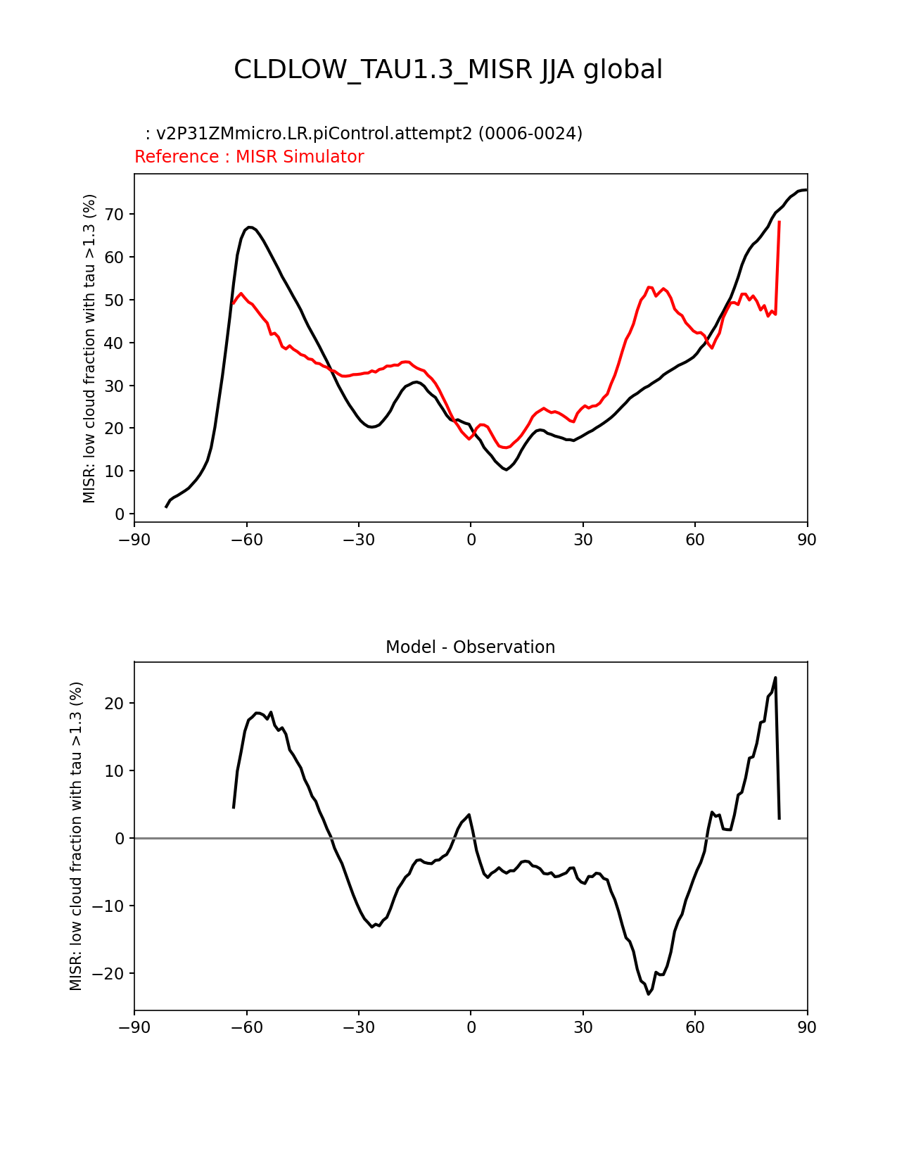 Use this command to recreate this image: | e3sm_diags zonal_mean_xy --no_viewer --case_id 'Cloud MISR' --sets 'zonal_mean_xy' --run_type 'model_vs_obs' --variables 'CLDLOW_TAU1.3_MISR' --seasons 'JJA' --regions 'global' --regrid_tool 'esmf' --regrid_method 'conservative' --main_title 'CLDLOW_TAU1.3_MISR JJA global' --backend 'mpl' --output_format 'png' --canvas_size_w '1212' --canvas_size_h '1628' --figsize '8.5' '11.0' --dpi '150' --arrows --test_name 'v2P31ZMmicro.LR.piControl.attempt2' --test_title ' ' --test_colormap 'cet_rainbow.rgb' --ref_name 'MISRCOSP' --reference_name 'MISR Simulator' --reference_colormap 'cet_rainbow.rgb' --diff_title 'Model - Observation' --diff_colormap 'diverging_bwr.rgb' --num_workers '4' --granulate 'variables' 'seasons' 'plevs' 'regions' --selectors 'sets' 'seasons' --reference_data_path '/global/cfs/cdirs/e3sm/acme_diags/obs_for_e3sm_diags/climatology/' --test_data_path '/global/cscratch1/sd/xsongsio/DATA/E3SM2_P3/v2P31ZMmicro.LR.piControl/diag/clim_rgr/19yr/' --results_dir '/global/cfs/cdirs/e3sm/www/xsongsio/v2P31ZMmicro.LR.piControl.attempt2/19yr' |
