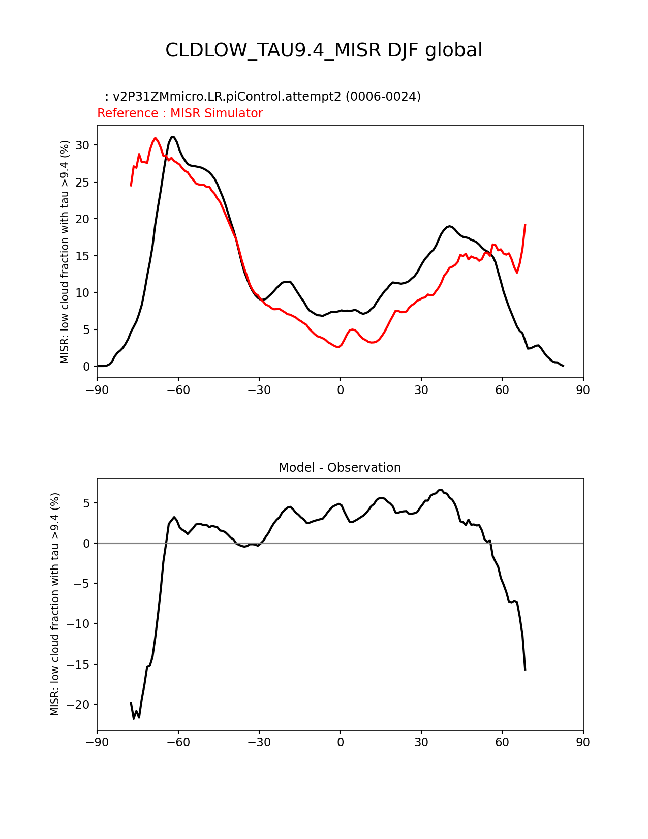 Use this command to recreate this image: | e3sm_diags zonal_mean_xy --no_viewer --case_id 'Cloud MISR' --sets 'zonal_mean_xy' --run_type 'model_vs_obs' --variables 'CLDLOW_TAU9.4_MISR' --seasons 'DJF' --regions 'global' --regrid_tool 'esmf' --regrid_method 'conservative' --main_title 'CLDLOW_TAU9.4_MISR DJF global' --backend 'mpl' --output_format 'png' --canvas_size_w '1212' --canvas_size_h '1628' --figsize '8.5' '11.0' --dpi '150' --arrows --test_name 'v2P31ZMmicro.LR.piControl.attempt2' --test_title ' ' --test_colormap 'cet_rainbow.rgb' --ref_name 'MISRCOSP' --reference_name 'MISR Simulator' --reference_colormap 'cet_rainbow.rgb' --diff_title 'Model - Observation' --diff_colormap 'diverging_bwr.rgb' --num_workers '4' --granulate 'variables' 'seasons' 'plevs' 'regions' --selectors 'sets' 'seasons' --reference_data_path '/global/cfs/cdirs/e3sm/acme_diags/obs_for_e3sm_diags/climatology/' --test_data_path '/global/cscratch1/sd/xsongsio/DATA/E3SM2_P3/v2P31ZMmicro.LR.piControl/diag/clim_rgr/19yr/' --results_dir '/global/cfs/cdirs/e3sm/www/xsongsio/v2P31ZMmicro.LR.piControl.attempt2/19yr' |