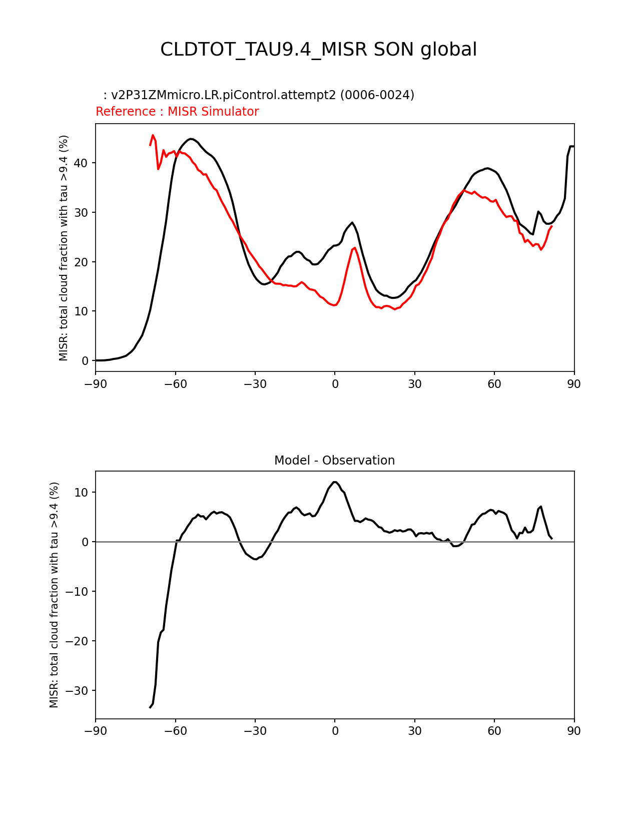 Use this command to recreate this image: | e3sm_diags zonal_mean_xy --no_viewer --case_id 'Cloud MISR' --sets 'zonal_mean_xy' --run_type 'model_vs_obs' --variables 'CLDTOT_TAU9.4_MISR' --seasons 'SON' --regions 'global' --regrid_tool 'esmf' --regrid_method 'conservative' --main_title 'CLDTOT_TAU9.4_MISR SON global' --backend 'mpl' --output_format 'png' --canvas_size_w '1212' --canvas_size_h '1628' --figsize '8.5' '11.0' --dpi '150' --arrows --test_name 'v2P31ZMmicro.LR.piControl.attempt2' --test_title ' ' --test_colormap 'cet_rainbow.rgb' --ref_name 'MISRCOSP' --reference_name 'MISR Simulator' --reference_colormap 'cet_rainbow.rgb' --diff_title 'Model - Observation' --diff_colormap 'diverging_bwr.rgb' --num_workers '4' --granulate 'variables' 'seasons' 'plevs' 'regions' --selectors 'sets' 'seasons' --reference_data_path '/global/cfs/cdirs/e3sm/acme_diags/obs_for_e3sm_diags/climatology/' --test_data_path '/global/cscratch1/sd/xsongsio/DATA/E3SM2_P3/v2P31ZMmicro.LR.piControl/diag/clim_rgr/19yr/' --results_dir '/global/cfs/cdirs/e3sm/www/xsongsio/v2P31ZMmicro.LR.piControl.attempt2/19yr' |