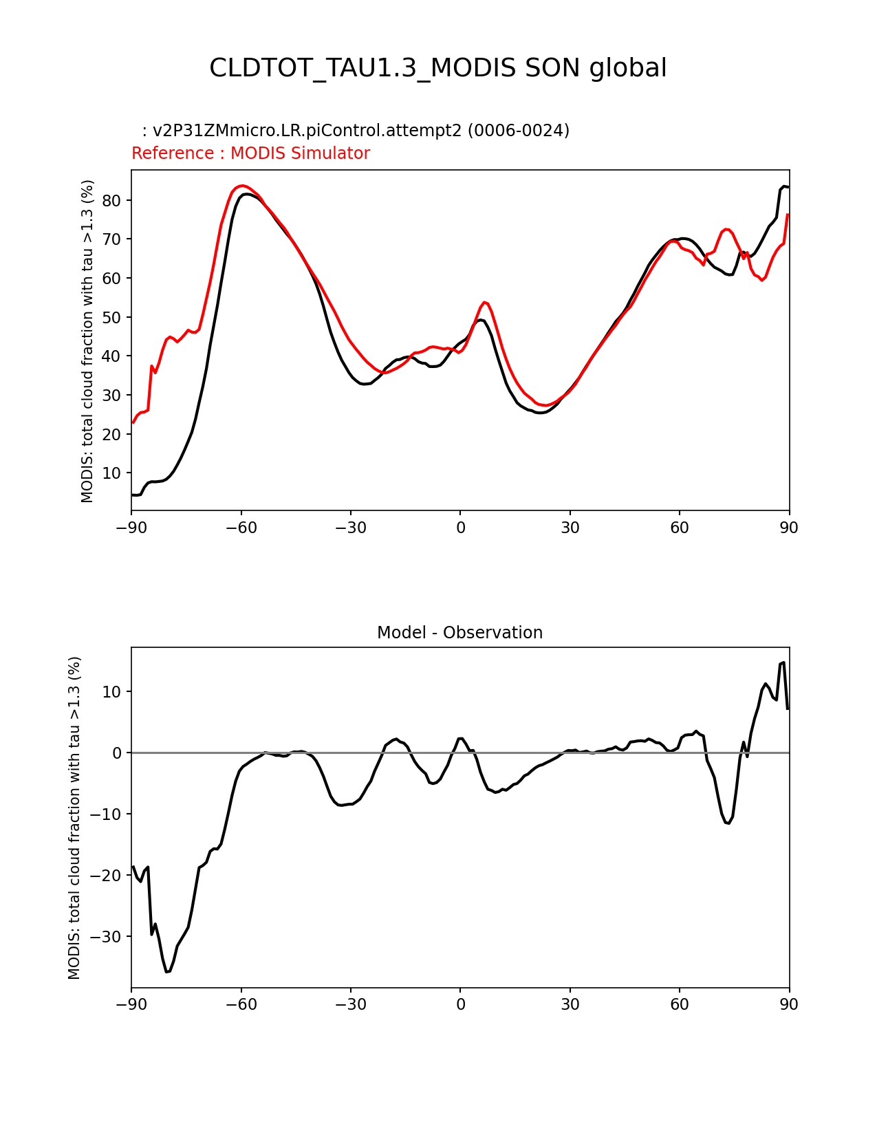 Use this command to recreate this image: | e3sm_diags zonal_mean_xy --no_viewer --case_id 'Cloud MODIS' --sets 'zonal_mean_xy' --run_type 'model_vs_obs' --variables 'CLDTOT_TAU1.3_MODIS' --seasons 'SON' --regions 'global' --regrid_tool 'esmf' --regrid_method 'conservative' --main_title 'CLDTOT_TAU1.3_MODIS SON global' --backend 'mpl' --output_format 'png' --canvas_size_w '1212' --canvas_size_h '1628' --figsize '8.5' '11.0' --dpi '150' --arrows --test_name 'v2P31ZMmicro.LR.piControl.attempt2' --test_title ' ' --test_colormap 'cet_rainbow.rgb' --ref_name 'MODISCOSP' --reference_name 'MODIS Simulator' --reference_colormap 'cet_rainbow.rgb' --diff_title 'Model - Observation' --diff_colormap 'diverging_bwr.rgb' --num_workers '4' --granulate 'variables' 'seasons' 'plevs' 'regions' --selectors 'sets' 'seasons' --reference_data_path '/global/cfs/cdirs/e3sm/acme_diags/obs_for_e3sm_diags/climatology/' --test_data_path '/global/cscratch1/sd/xsongsio/DATA/E3SM2_P3/v2P31ZMmicro.LR.piControl/diag/clim_rgr/19yr/' --results_dir '/global/cfs/cdirs/e3sm/www/xsongsio/v2P31ZMmicro.LR.piControl.attempt2/19yr' |