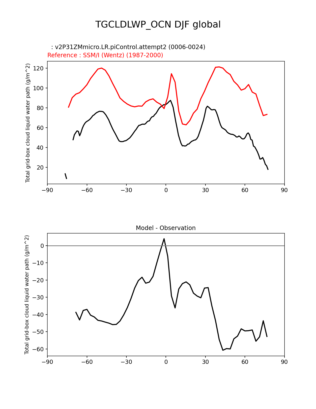 Use this command to recreate this image: | e3sm_diags zonal_mean_xy --no_viewer --case_id 'Cloud SSM/I' --sets 'zonal_mean_xy' --run_type 'model_vs_obs' --variables 'TGCLDLWP_OCN' --seasons 'DJF' --regions 'global' --regrid_tool 'esmf' --regrid_method 'conservative' --main_title 'TGCLDLWP_OCN DJF global' --backend 'mpl' --output_format 'png' --canvas_size_w '1212' --canvas_size_h '1628' --figsize '8.5' '11.0' --dpi '150' --arrows --test_name 'v2P31ZMmicro.LR.piControl.attempt2' --test_title ' ' --test_colormap 'cet_rainbow.rgb' --ref_name 'SSMI' --reference_name 'SSM/I (Wentz)' --reference_colormap 'cet_rainbow.rgb' --diff_title 'Model - Observation' --diff_colormap 'diverging_bwr.rgb' --num_workers '4' --granulate 'variables' 'seasons' 'plevs' 'regions' --selectors 'sets' 'seasons' --reference_data_path '/global/cfs/cdirs/e3sm/acme_diags/obs_for_e3sm_diags/climatology/' --test_data_path '/global/cscratch1/sd/xsongsio/DATA/E3SM2_P3/v2P31ZMmicro.LR.piControl/diag/clim_rgr/19yr/' --results_dir '/global/cfs/cdirs/e3sm/www/xsongsio/v2P31ZMmicro.LR.piControl.attempt2/19yr' |