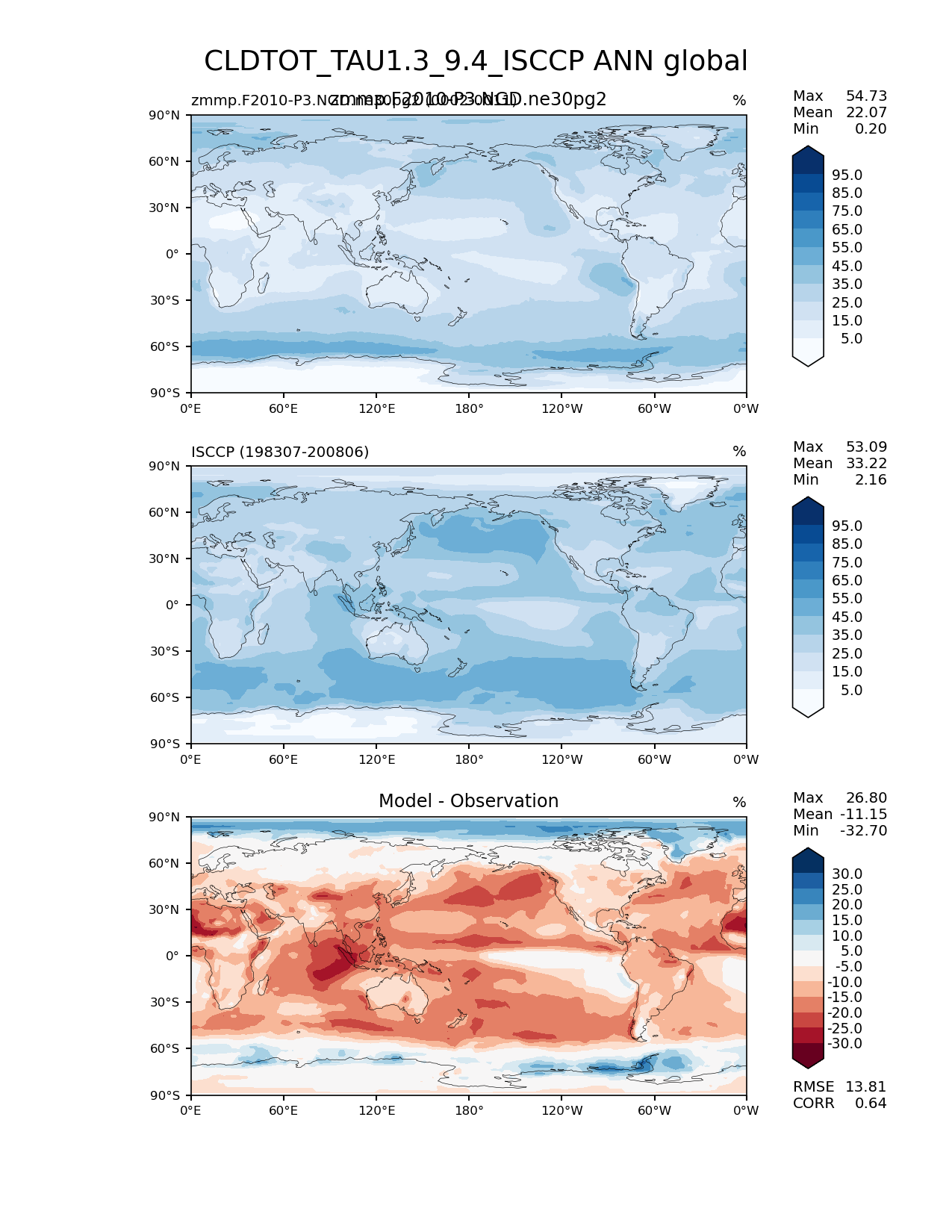 Use this command to recreate this image: | e3sm_diags lat_lon --no_viewer --case_id 'Cloud ISCCP' --sets 'lat_lon' --run_type 'model_vs_obs' --variables 'CLDTOT_TAU1.3_9.4_ISCCP' --seasons 'ANN' --regions 'global' --regrid_tool 'esmf' --regrid_method 'conservative' --main_title 'CLDTOT_TAU1.3_9.4_ISCCP ANN global' --backend 'mpl' --output_format 'png' --canvas_size_w '1212' --canvas_size_h '1628' --figsize '8.5' '11.0' --dpi '150' --arrows --contour_levels '5' '15' '25' '35' '45' '55' '65' '75' '85' '95' --test_name 'zmmp.F2010-P3.NGD.ne30pg2' --test_title 'zmmp.F2010-P3.NGD.ne30pg2' --test_colormap 'Blues' --ref_name 'ISCCPCOSP' --reference_name 'ISCCP' --reference_colormap 'Blues' --diff_title 'Model - Observation' --diff_colormap 'RdBu' --diff_levels '-30' '-25' '-20' '-15' '-10' '-5' '5' '10' '15' '20' '25' '30' --num_workers '4' --granulate 'variables' 'seasons' 'plevs' 'regions' --selectors 'sets' 'seasons' --reference_data_path '/global/cfs/cdirs/e3sm/acme_diags/obs_for_e3sm_diags/climatology/' --test_data_path '/global/cscratch1/sd/xsongsio/E3SM_simulations/zmmp.F2010-P3.NGD.ne30pg2/diag/clim_rgr/10yr/' --results_dir '/global/cfs/cdirs/e3sm/www/xsongsio/zmmp.F2010-P3.NGD.ne30pg2/10yr' |