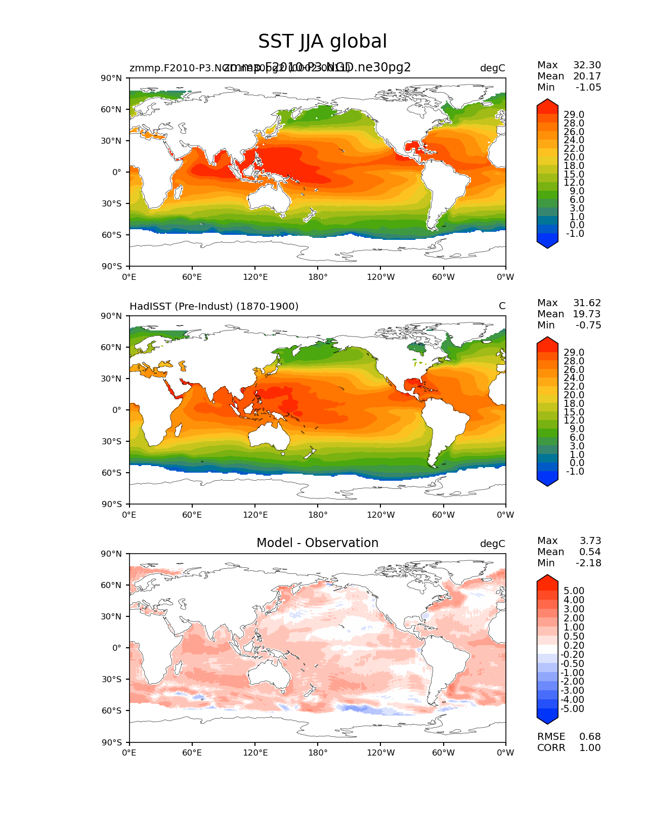 Use this command to recreate this image: | e3sm_diags lat_lon --no_viewer --case_id 'SST_PI_HadISST' --sets 'lat_lon' --run_type 'model_vs_obs' --variables 'SST' --seasons 'JJA' --regions 'global' --regrid_tool 'esmf' --regrid_method 'conservative' --main_title 'SST JJA global' --backend 'mpl' --output_format 'png' --canvas_size_w '1212' --canvas_size_h '1628' --figsize '8.5' '11.0' --dpi '150' --arrows --contour_levels '-1' '0' '1' '3' '6' '9' '12' '15' '18' '20' '22' '24' '26' '28' '29' --test_name 'zmmp.F2010-P3.NGD.ne30pg2' --test_title 'zmmp.F2010-P3.NGD.ne30pg2' --test_colormap 'cet_rainbow.rgb' --ref_name 'HadISST_PI' --reference_name 'HadISST (Pre-Indust)' --reference_colormap 'cet_rainbow.rgb' --diff_title 'Model - Observation' --diff_colormap 'diverging_bwr.rgb' --diff_levels '-5' '-4' '-3' '-2' '-1' '-0.5' '-0.2' '0.2' '0.5' '1' '2' '3' '4' '5' --num_workers '4' --granulate 'variables' 'seasons' 'plevs' 'regions' --selectors 'sets' 'seasons' --reference_data_path '/global/cfs/cdirs/e3sm/acme_diags/obs_for_e3sm_diags/climatology/' --test_data_path '/global/cscratch1/sd/xsongsio/E3SM_simulations/zmmp.F2010-P3.NGD.ne30pg2/diag/clim_rgr/10yr/' --results_dir '/global/cfs/cdirs/e3sm/www/xsongsio/zmmp.F2010-P3.NGD.ne30pg2/10yr' |