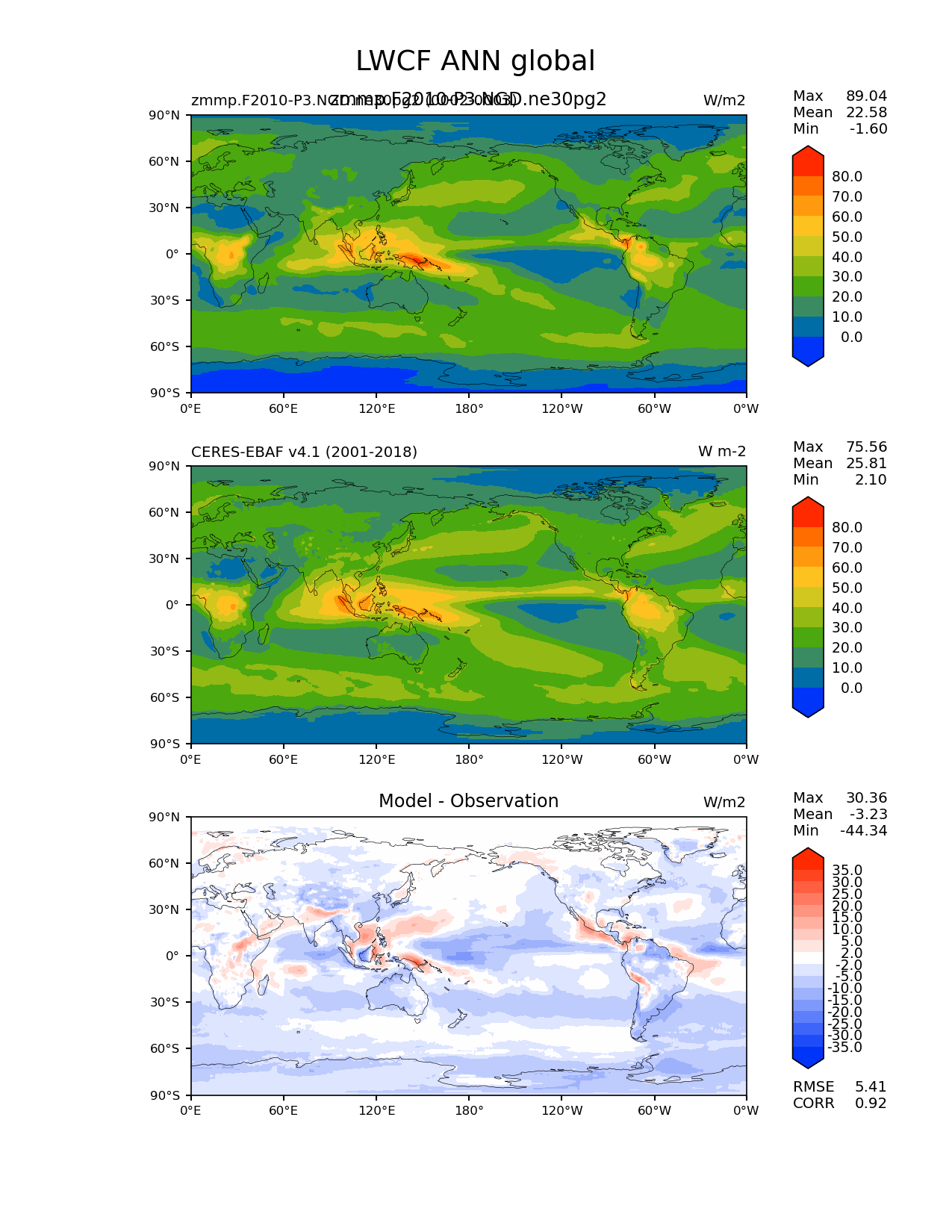 Use this command to recreate this image: | e3sm_diags lat_lon --no_viewer --case_id 'CERES-EBAF-TOA-v4.1' --sets 'lat_lon' --run_type 'model_vs_obs' --variables 'LWCF' --seasons 'ANN' --regions 'global' --regrid_tool 'esmf' --regrid_method 'conservative' --main_title 'LWCF ANN global' --backend 'mpl' --output_format 'png' --canvas_size_w '1212' --canvas_size_h '1628' --figsize '8.5' '11.0' --dpi '150' --arrows --contour_levels '0' '10' '20' '30' '40' '50' '60' '70' '80' --test_name 'zmmp.F2010-P3.NGD.ne30pg2' --test_title 'zmmp.F2010-P3.NGD.ne30pg2' --test_colormap 'cet_rainbow.rgb' --ref_name 'ceres_ebaf_toa_v4.1' --reference_name 'CERES-EBAF v4.1' --reference_colormap 'cet_rainbow.rgb' --diff_title 'Model - Observation' --diff_colormap 'diverging_bwr.rgb' --diff_levels '-35' '-30' '-25' '-20' '-15' '-10' '-5' '-2' '2' '5' '10' '15' '20' '25' '30' '35' --num_workers '4' --granulate 'variables' 'seasons' 'plevs' 'regions' --selectors 'sets' 'seasons' --reference_data_path '/global/cfs/cdirs/e3sm/acme_diags/obs_for_e3sm_diags/climatology/' --test_data_path '/global/cscratch1/sd/xsongsio/E3SM_simulations/zmmp.F2010-P3.NGD.ne30pg2/diag/clim_rgr/2yr/' --results_dir '/global/cfs/cdirs/e3sm/www/xsongsio/zmmp.F2010-P3.NGD.ne30pg2/2yr' |