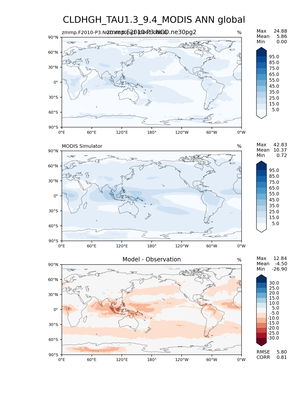 Use this command to recreate this image: | e3sm_diags lat_lon --no_viewer --case_id 'Cloud MODIS' --sets 'lat_lon' --run_type 'model_vs_obs' --variables 'CLDHGH_TAU1.3_9.4_MODIS' --seasons 'ANN' --regions 'global' --regrid_tool 'esmf' --regrid_method 'conservative' --main_title 'CLDHGH_TAU1.3_9.4_MODIS ANN global' --backend 'mpl' --output_format 'png' --canvas_size_w '1212' --canvas_size_h '1628' --figsize '8.5' '11.0' --dpi '150' --arrows --contour_levels '5' '15' '25' '35' '45' '55' '65' '75' '85' '95' --test_name 'zmmp.F2010-P3.NGD.ne30pg2' --test_title 'zmmp.F2010-P3.NGD.ne30pg2' --test_colormap 'Blues' --ref_name 'MODISCOSP' --reference_name 'MODIS Simulator' --reference_colormap 'Blues' --diff_title 'Model - Observation' --diff_colormap 'RdBu' --diff_levels '-30' '-25' '-20' '-15' '-10' '-5' '5' '10' '15' '20' '25' '30' --num_workers '4' --granulate 'variables' 'seasons' 'plevs' 'regions' --selectors 'sets' 'seasons' --reference_data_path '/global/cfs/cdirs/e3sm/acme_diags/obs_for_e3sm_diags/climatology/' --test_data_path '/global/cscratch1/sd/xsongsio/E3SM_simulations/zmmp.F2010-P3.NGD.ne30pg2/diag/clim_rgr/2yr/' --results_dir '/global/cfs/cdirs/e3sm/www/xsongsio/zmmp.F2010-P3.NGD.ne30pg2/2yr' |
