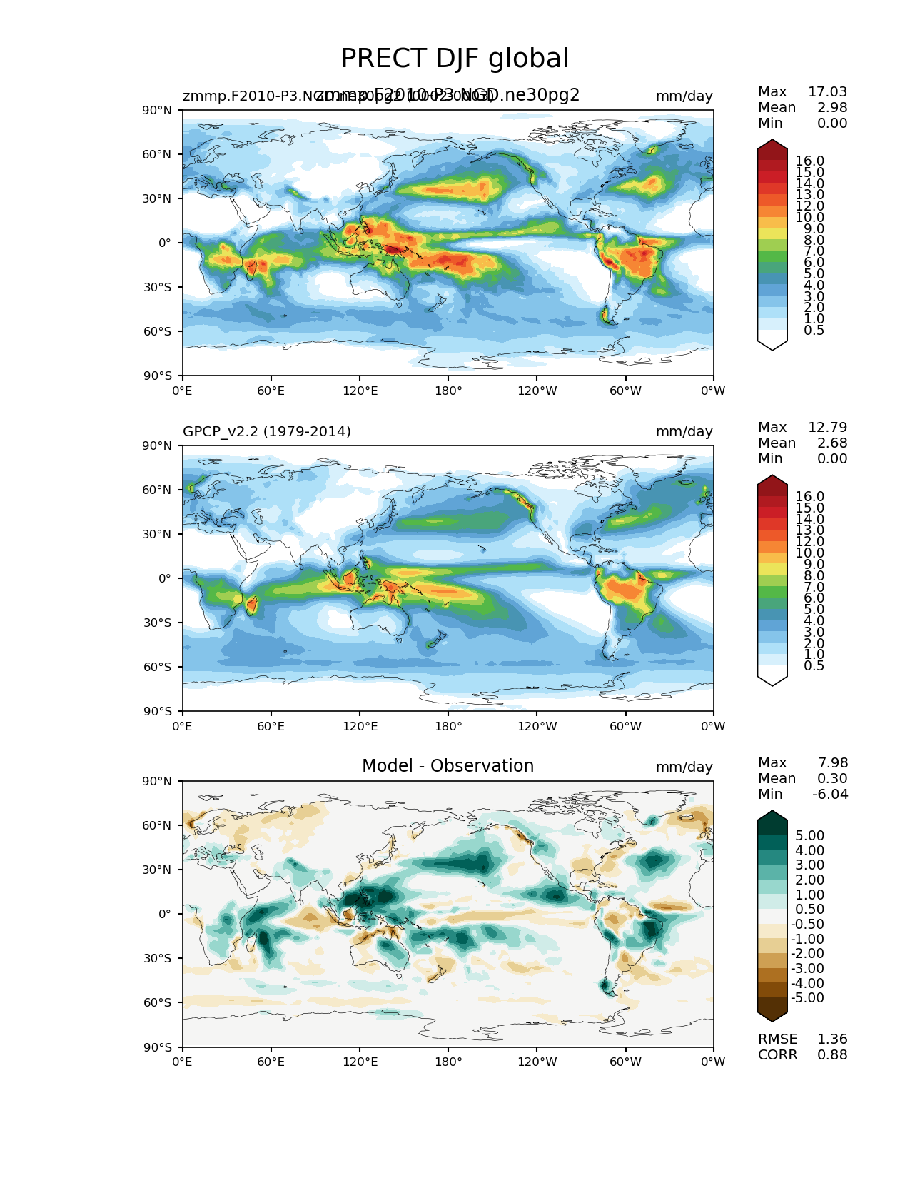 Use this command to recreate this image: | e3sm_diags lat_lon --no_viewer --case_id 'GPCP_v2.2' --sets 'lat_lon' --run_type 'model_vs_obs' --variables 'PRECT' --seasons 'DJF' --regions 'global' --regrid_tool 'esmf' --regrid_method 'conservative' --main_title 'PRECT DJF global' --backend 'mpl' --output_format 'png' --canvas_size_w '1212' --canvas_size_h '1628' --figsize '8.5' '11.0' --dpi '150' --arrows --contour_levels '0.5' '1' '2' '3' '4' '5' '6' '7' '8' '9' '10' '12' '13' '14' '15' '16' --test_name 'zmmp.F2010-P3.NGD.ne30pg2' --test_title 'zmmp.F2010-P3.NGD.ne30pg2' --test_colormap 'WhiteBlueGreenYellowRed.rgb' --ref_name 'GPCP_v2.2' --reference_name 'GPCP_v2.2' --reference_colormap 'WhiteBlueGreenYellowRed.rgb' --diff_title 'Model - Observation' --diff_colormap 'BrBG' --diff_levels '-5' '-4' '-3' '-2' '-1' '-0.5' '0.5' '1' '2' '3' '4' '5' --num_workers '4' --granulate 'variables' 'seasons' 'plevs' 'regions' --selectors 'sets' 'seasons' --reference_data_path '/global/cfs/cdirs/e3sm/acme_diags/obs_for_e3sm_diags/climatology/' --test_data_path '/global/cscratch1/sd/xsongsio/E3SM_simulations/zmmp.F2010-P3.NGD.ne30pg2/diag/clim_rgr/2yr/' --results_dir '/global/cfs/cdirs/e3sm/www/xsongsio/zmmp.F2010-P3.NGD.ne30pg2/2yr' |