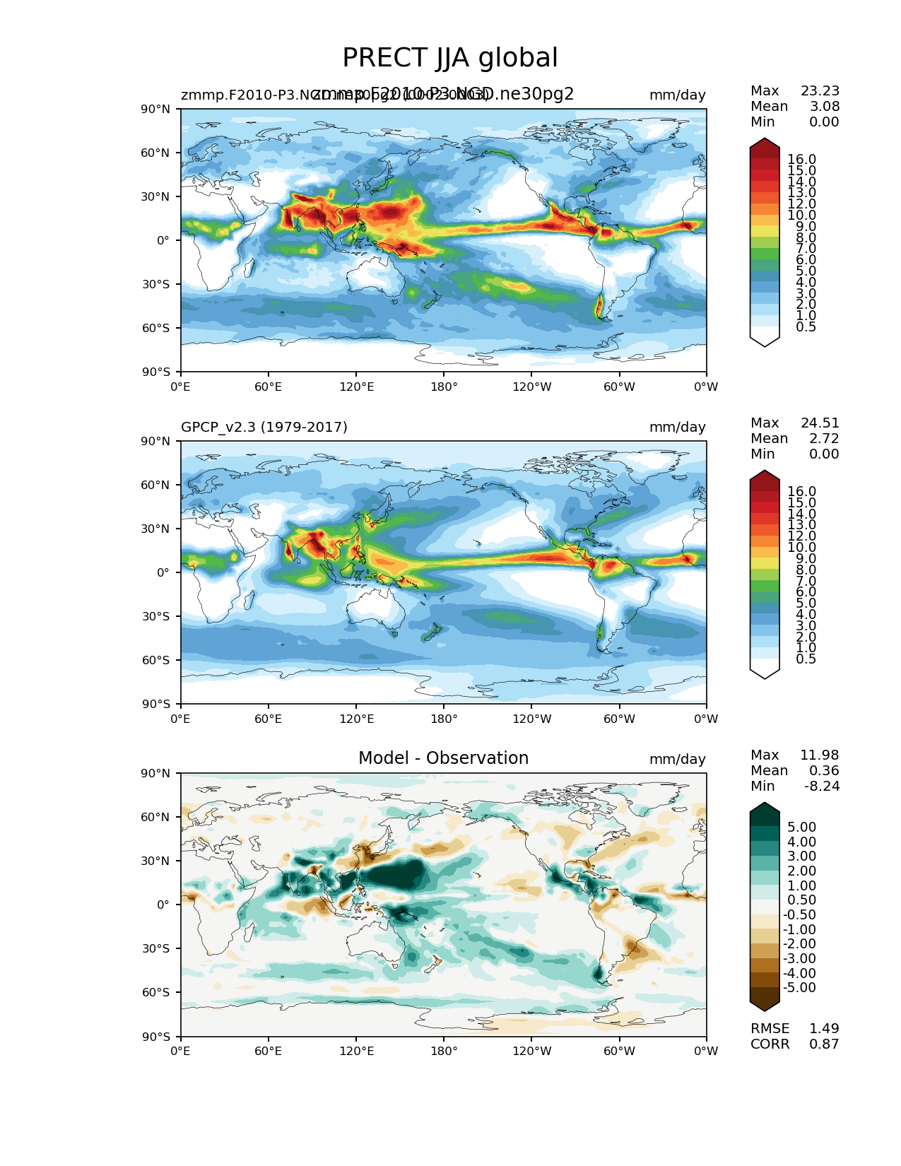 Use this command to recreate this image: | e3sm_diags lat_lon --no_viewer --case_id 'GPCP_v2.3' --sets 'lat_lon' --run_type 'model_vs_obs' --variables 'PRECT' --seasons 'JJA' --regions 'global' --regrid_tool 'esmf' --regrid_method 'conservative' --main_title 'PRECT JJA global' --backend 'mpl' --output_format 'png' --canvas_size_w '1212' --canvas_size_h '1628' --figsize '8.5' '11.0' --dpi '150' --arrows --contour_levels '0.5' '1' '2' '3' '4' '5' '6' '7' '8' '9' '10' '12' '13' '14' '15' '16' --test_name 'zmmp.F2010-P3.NGD.ne30pg2' --test_title 'zmmp.F2010-P3.NGD.ne30pg2' --test_colormap 'WhiteBlueGreenYellowRed.rgb' --ref_name 'GPCP_v2.3' --reference_name 'GPCP_v2.3' --reference_colormap 'WhiteBlueGreenYellowRed.rgb' --diff_title 'Model - Observation' --diff_colormap 'BrBG' --diff_levels '-5' '-4' '-3' '-2' '-1' '-0.5' '0.5' '1' '2' '3' '4' '5' --num_workers '4' --granulate 'variables' 'seasons' 'plevs' 'regions' --selectors 'sets' 'seasons' --reference_data_path '/global/cfs/cdirs/e3sm/acme_diags/obs_for_e3sm_diags/climatology/' --test_data_path '/global/cscratch1/sd/xsongsio/E3SM_simulations/zmmp.F2010-P3.NGD.ne30pg2/diag/clim_rgr/2yr/' --results_dir '/global/cfs/cdirs/e3sm/www/xsongsio/zmmp.F2010-P3.NGD.ne30pg2/2yr' |