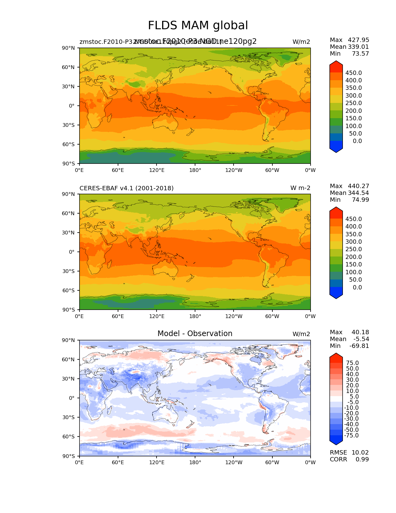 Use this command to recreate this image: | e3sm_diags lat_lon --no_viewer --case_id 'CERES-EBAF-surface-v4.1' --sets 'lat_lon' --run_type 'model_vs_obs' --variables 'FLDS' --seasons 'MAM' --regions 'global' --regrid_tool 'esmf' --regrid_method 'conservative' --main_title 'FLDS MAM global' --backend 'mpl' --output_format 'png' --canvas_size_w '1212' --canvas_size_h '1628' --figsize '8.5' '11.0' --dpi '150' --arrows --contour_levels '0' '50' '100' '150' '200' '250' '300' '350' '400' '450' --test_name 'zmstoc.F2010-P3.NGD.ne120pg2' --test_title 'zmstoc.F2010-P3.NGD.ne120pg2' --test_colormap 'cet_rainbow.rgb' --ref_name 'ceres_ebaf_surface_v4.1' --reference_name 'CERES-EBAF v4.1' --reference_colormap 'cet_rainbow.rgb' --diff_title 'Model - Observation' --diff_colormap 'diverging_bwr.rgb' --diff_levels '-75' '-50' '-40' '-30' '-20' '-10' '-5' '5' '10' '20' '30' '40' '50' '75' --num_workers '4' --granulate 'variables' 'seasons' 'plevs' 'regions' --selectors 'sets' 'seasons' --reference_data_path '/global/cfs/cdirs/e3sm/acme_diags/obs_for_e3sm_diags/climatology/' --test_data_path '/global/cscratch1/sd/xsongsio/E3SM_simulations/zmstoc.F2010-P3.NGD.ne120pg2/diag/clim_rgr/6yr/' --results_dir '/global/cfs/cdirs/e3sm/www/xsongsio/zmstoc.F2010-P3.NGD.ne120pg2/6yr' |