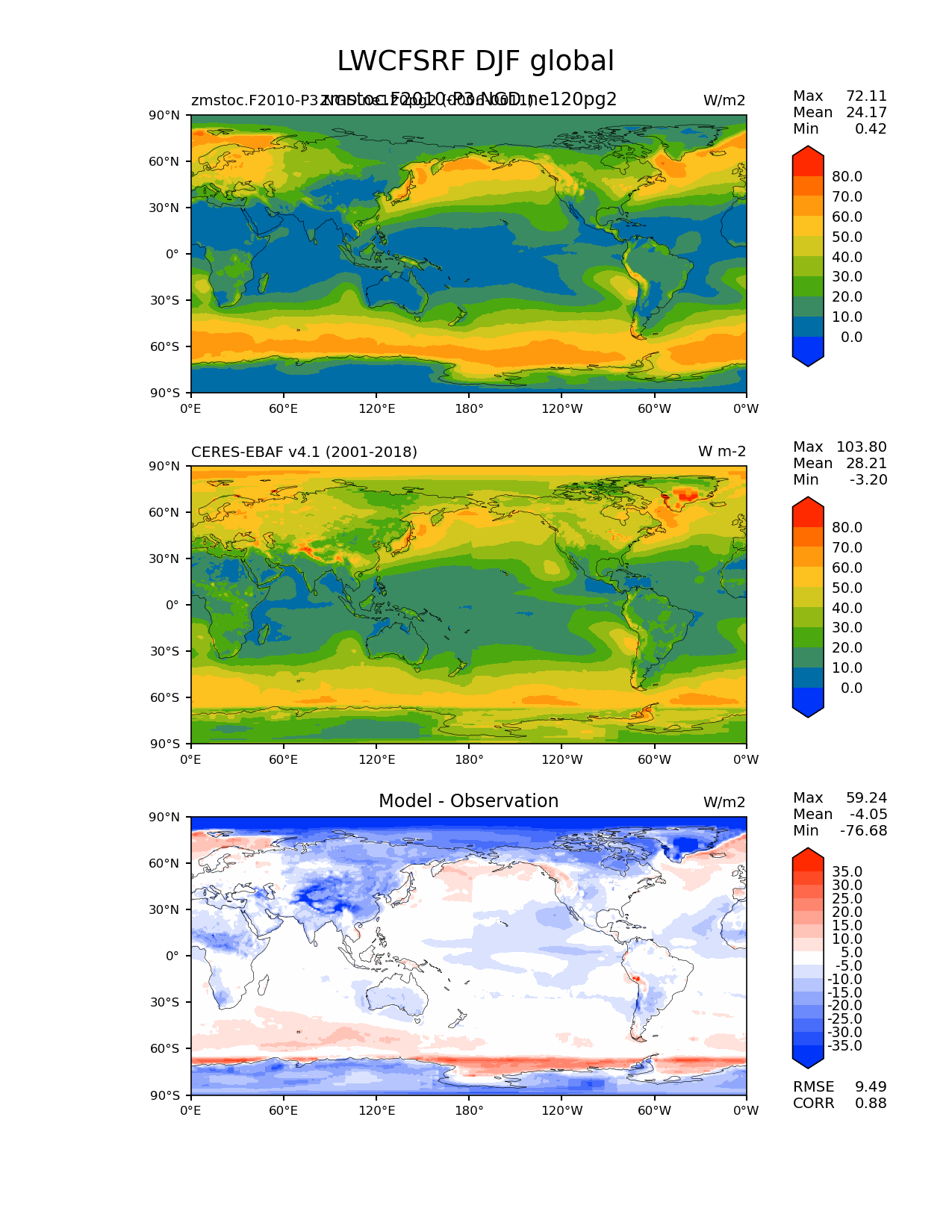 Use this command to recreate this image: | e3sm_diags lat_lon --no_viewer --case_id 'CERES-EBAF-surface-v4.1' --sets 'lat_lon' --run_type 'model_vs_obs' --variables 'LWCFSRF' --seasons 'DJF' --regions 'global' --regrid_tool 'esmf' --regrid_method 'conservative' --main_title 'LWCFSRF DJF global' --backend 'mpl' --output_format 'png' --canvas_size_w '1212' --canvas_size_h '1628' --figsize '8.5' '11.0' --dpi '150' --arrows --contour_levels '0' '10' '20' '30' '40' '50' '60' '70' '80' --test_name 'zmstoc.F2010-P3.NGD.ne120pg2' --test_title 'zmstoc.F2010-P3.NGD.ne120pg2' --test_colormap 'cet_rainbow.rgb' --ref_name 'ceres_ebaf_surface_v4.1' --reference_name 'CERES-EBAF v4.1' --reference_colormap 'cet_rainbow.rgb' --diff_title 'Model - Observation' --diff_colormap 'diverging_bwr.rgb' --diff_levels '-35' '-30' '-25' '-20' '-15' '-10' '-5' '5' '10' '15' '20' '25' '30' '35' --num_workers '4' --granulate 'variables' 'seasons' 'plevs' 'regions' --selectors 'sets' 'seasons' --reference_data_path '/global/cfs/cdirs/e3sm/acme_diags/obs_for_e3sm_diags/climatology/' --test_data_path '/global/cscratch1/sd/xsongsio/E3SM_simulations/zmstoc.F2010-P3.NGD.ne120pg2/diag/clim_rgr/6yr/' --results_dir '/global/cfs/cdirs/e3sm/www/xsongsio/zmstoc.F2010-P3.NGD.ne120pg2/6yr' |