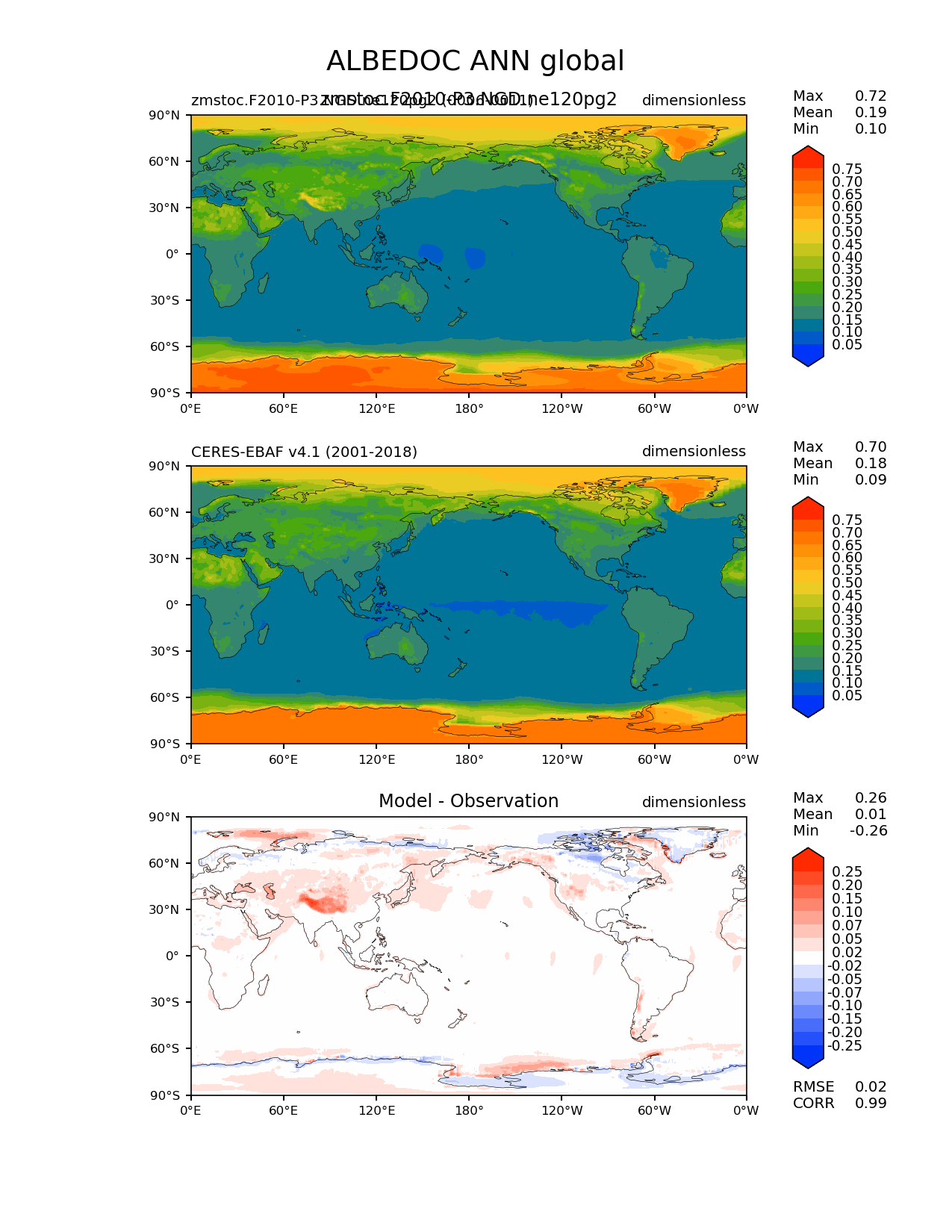Use this command to recreate this image: | e3sm_diags lat_lon --no_viewer --case_id 'CERES-EBAF-TOA-v4.1' --sets 'lat_lon' --run_type 'model_vs_obs' --variables 'ALBEDOC' --seasons 'ANN' --regions 'global' --regrid_tool 'esmf' --regrid_method 'conservative' --main_title 'ALBEDOC ANN global' --backend 'mpl' --output_format 'png' --canvas_size_w '1212' --canvas_size_h '1628' --figsize '8.5' '11.0' --dpi '150' --arrows --contour_levels '0.05' '0.1' '0.15' '0.2' '0.25' '0.3' '0.35' '0.4' '0.45' '0.5' '0.55' '0.6' '0.65' '0.7' '0.75' --test_name 'zmstoc.F2010-P3.NGD.ne120pg2' --test_title 'zmstoc.F2010-P3.NGD.ne120pg2' --test_colormap 'cet_rainbow.rgb' --ref_name 'ceres_ebaf_toa_v4.1' --reference_name 'CERES-EBAF v4.1' --reference_colormap 'cet_rainbow.rgb' --diff_title 'Model - Observation' --diff_colormap 'diverging_bwr.rgb' --diff_levels '-0.25' '-0.2' '-0.15' '-0.1' '-0.07' '-0.05' '-0.02' '0.02' '0.05' '0.07' '0.1' '0.15' '0.2' '0.25' --num_workers '4' --granulate 'variables' 'seasons' 'plevs' 'regions' --selectors 'sets' 'seasons' --reference_data_path '/global/cfs/cdirs/e3sm/acme_diags/obs_for_e3sm_diags/climatology/' --test_data_path '/global/cscratch1/sd/xsongsio/E3SM_simulations/zmstoc.F2010-P3.NGD.ne120pg2/diag/clim_rgr/6yr/' --results_dir '/global/cfs/cdirs/e3sm/www/xsongsio/zmstoc.F2010-P3.NGD.ne120pg2/6yr' |