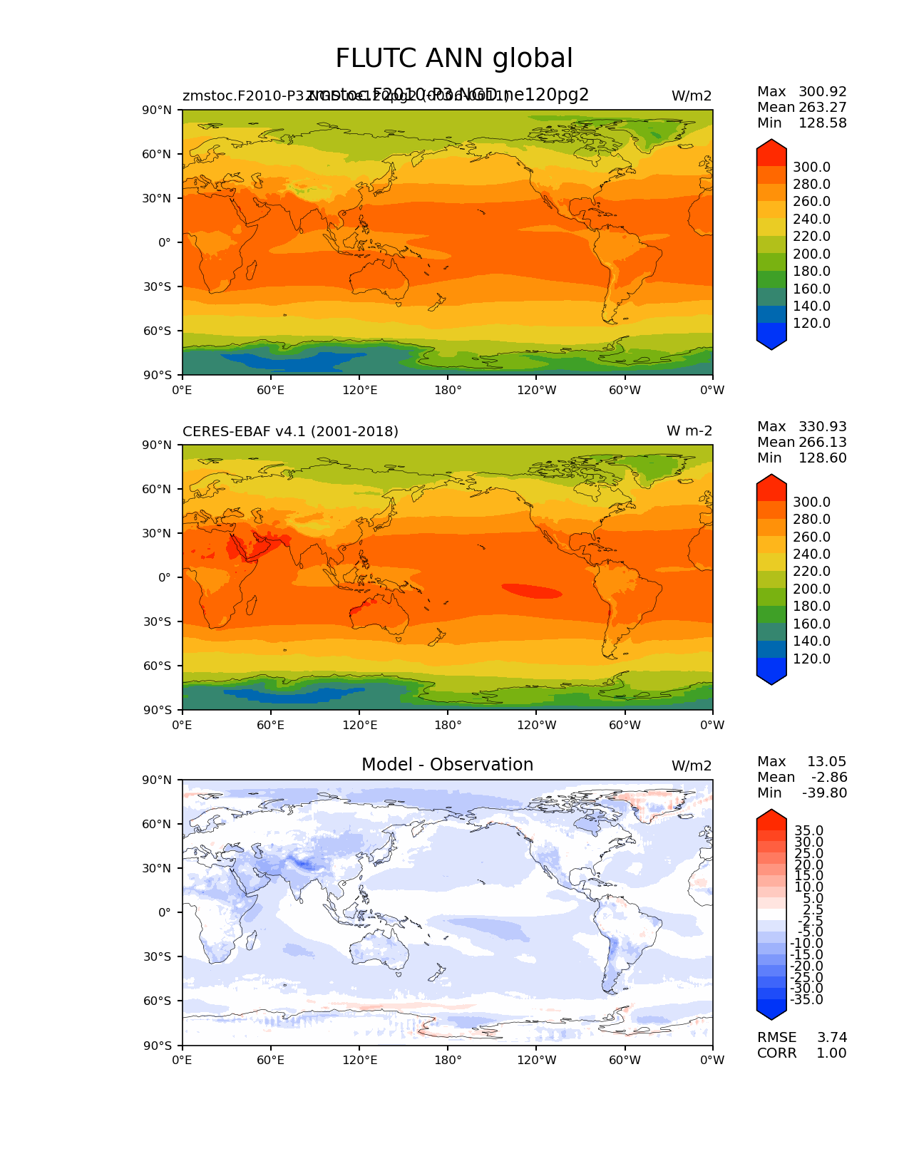 Use this command to recreate this image: | e3sm_diags lat_lon --no_viewer --case_id 'CERES-EBAF-TOA-v4.1' --sets 'lat_lon' --run_type 'model_vs_obs' --variables 'FLUTC' --seasons 'ANN' --regions 'global' --regrid_tool 'esmf' --regrid_method 'conservative' --main_title 'FLUTC ANN global' --backend 'mpl' --output_format 'png' --canvas_size_w '1212' --canvas_size_h '1628' --figsize '8.5' '11.0' --dpi '150' --arrows --contour_levels '120' '140' '160' '180' '200' '220' '240' '260' '280' '300' --test_name 'zmstoc.F2010-P3.NGD.ne120pg2' --test_title 'zmstoc.F2010-P3.NGD.ne120pg2' --test_colormap 'cet_rainbow.rgb' --ref_name 'ceres_ebaf_toa_v4.1' --reference_name 'CERES-EBAF v4.1' --reference_colormap 'cet_rainbow.rgb' --diff_title 'Model - Observation' --diff_colormap 'diverging_bwr.rgb' --diff_levels '-35' '-30' '-25' '-20' '-15' '-10' '-5' '-2.5' '2.5' '5' '10' '15' '20' '25' '30' '35' --num_workers '4' --granulate 'variables' 'seasons' 'plevs' 'regions' --selectors 'sets' 'seasons' --reference_data_path '/global/cfs/cdirs/e3sm/acme_diags/obs_for_e3sm_diags/climatology/' --test_data_path '/global/cscratch1/sd/xsongsio/E3SM_simulations/zmstoc.F2010-P3.NGD.ne120pg2/diag/clim_rgr/6yr/' --results_dir '/global/cfs/cdirs/e3sm/www/xsongsio/zmstoc.F2010-P3.NGD.ne120pg2/6yr' |