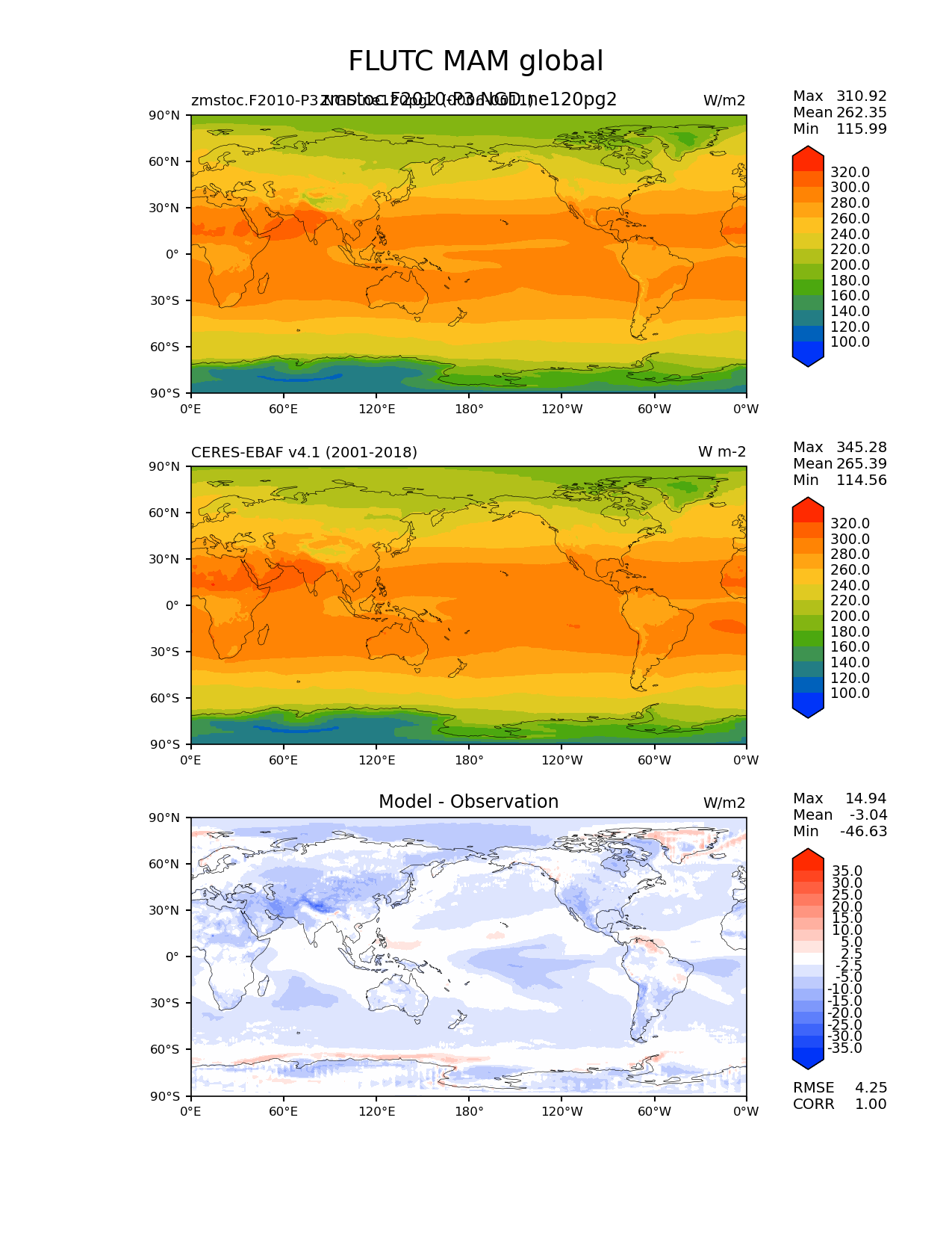 Use this command to recreate this image: | e3sm_diags lat_lon --no_viewer --case_id 'CERES-EBAF-TOA-v4.1' --sets 'lat_lon' --run_type 'model_vs_obs' --variables 'FLUTC' --seasons 'MAM' --regions 'global' --regrid_tool 'esmf' --regrid_method 'conservative' --main_title 'FLUTC MAM global' --backend 'mpl' --output_format 'png' --canvas_size_w '1212' --canvas_size_h '1628' --figsize '8.5' '11.0' --dpi '150' --arrows --contour_levels '100' '120' '140' '160' '180' '200' '220' '240' '260' '280' '300' '320' --test_name 'zmstoc.F2010-P3.NGD.ne120pg2' --test_title 'zmstoc.F2010-P3.NGD.ne120pg2' --test_colormap 'cet_rainbow.rgb' --ref_name 'ceres_ebaf_toa_v4.1' --reference_name 'CERES-EBAF v4.1' --reference_colormap 'cet_rainbow.rgb' --diff_title 'Model - Observation' --diff_colormap 'diverging_bwr.rgb' --diff_levels '-35' '-30' '-25' '-20' '-15' '-10' '-5' '-2.5' '2.5' '5' '10' '15' '20' '25' '30' '35' --num_workers '4' --granulate 'variables' 'seasons' 'plevs' 'regions' --selectors 'sets' 'seasons' --reference_data_path '/global/cfs/cdirs/e3sm/acme_diags/obs_for_e3sm_diags/climatology/' --test_data_path '/global/cscratch1/sd/xsongsio/E3SM_simulations/zmstoc.F2010-P3.NGD.ne120pg2/diag/clim_rgr/6yr/' --results_dir '/global/cfs/cdirs/e3sm/www/xsongsio/zmstoc.F2010-P3.NGD.ne120pg2/6yr' |