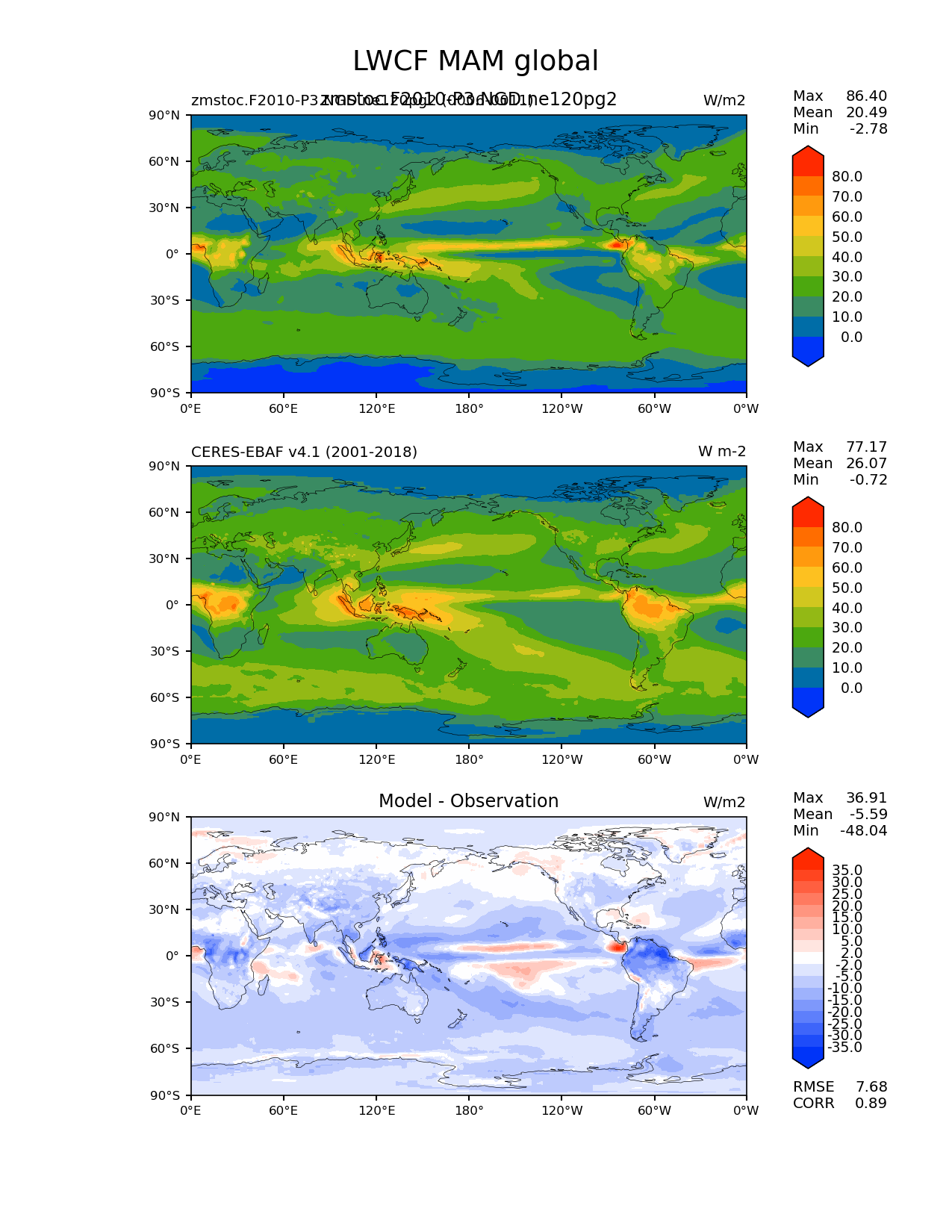 Use this command to recreate this image: | e3sm_diags lat_lon --no_viewer --case_id 'CERES-EBAF-TOA-v4.1' --sets 'lat_lon' --run_type 'model_vs_obs' --variables 'LWCF' --seasons 'MAM' --regions 'global' --regrid_tool 'esmf' --regrid_method 'conservative' --main_title 'LWCF MAM global' --backend 'mpl' --output_format 'png' --canvas_size_w '1212' --canvas_size_h '1628' --figsize '8.5' '11.0' --dpi '150' --arrows --contour_levels '0' '10' '20' '30' '40' '50' '60' '70' '80' --test_name 'zmstoc.F2010-P3.NGD.ne120pg2' --test_title 'zmstoc.F2010-P3.NGD.ne120pg2' --test_colormap 'cet_rainbow.rgb' --ref_name 'ceres_ebaf_toa_v4.1' --reference_name 'CERES-EBAF v4.1' --reference_colormap 'cet_rainbow.rgb' --diff_title 'Model - Observation' --diff_colormap 'diverging_bwr.rgb' --diff_levels '-35' '-30' '-25' '-20' '-15' '-10' '-5' '-2' '2' '5' '10' '15' '20' '25' '30' '35' --num_workers '4' --granulate 'variables' 'seasons' 'plevs' 'regions' --selectors 'sets' 'seasons' --reference_data_path '/global/cfs/cdirs/e3sm/acme_diags/obs_for_e3sm_diags/climatology/' --test_data_path '/global/cscratch1/sd/xsongsio/E3SM_simulations/zmstoc.F2010-P3.NGD.ne120pg2/diag/clim_rgr/6yr/' --results_dir '/global/cfs/cdirs/e3sm/www/xsongsio/zmstoc.F2010-P3.NGD.ne120pg2/6yr' |