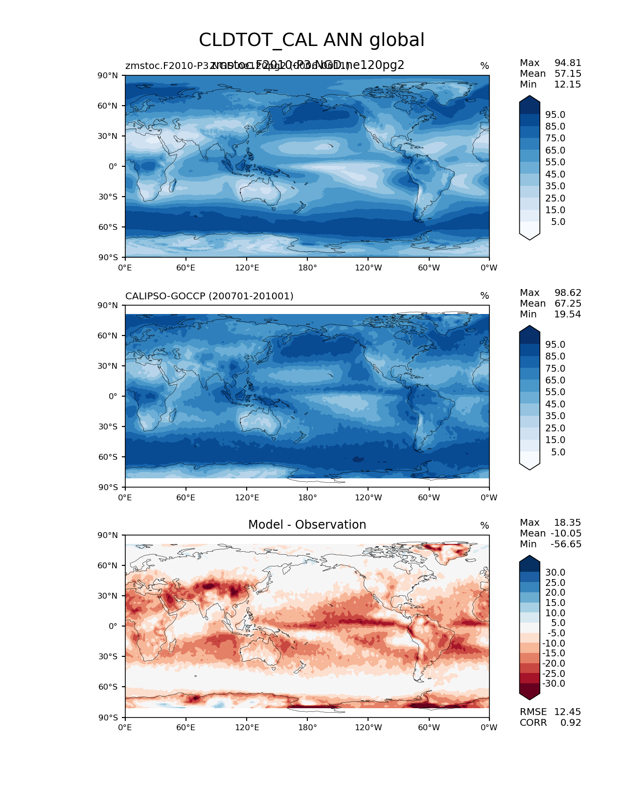 Use this command to recreate this image: | e3sm_diags lat_lon --no_viewer --case_id 'Cloud Calipso' --sets 'lat_lon' --run_type 'model_vs_obs' --variables 'CLDTOT_CAL' --seasons 'ANN' --regions 'global' --regrid_tool 'esmf' --regrid_method 'conservative' --main_title 'CLDTOT_CAL ANN global' --backend 'mpl' --output_format 'png' --canvas_size_w '1212' --canvas_size_h '1628' --figsize '8.5' '11.0' --dpi '150' --arrows --contour_levels '5' '15' '25' '35' '45' '55' '65' '75' '85' '95' --test_name 'zmstoc.F2010-P3.NGD.ne120pg2' --test_title 'zmstoc.F2010-P3.NGD.ne120pg2' --test_colormap 'Blues' --ref_name 'CALIPSOCOSP' --reference_name 'CALIPSO-GOCCP' --reference_colormap 'Blues' --diff_title 'Model - Observation' --diff_colormap 'RdBu' --diff_levels '-30' '-25' '-20' '-15' '-10' '-5' '5' '10' '15' '20' '25' '30' --num_workers '4' --granulate 'variables' 'seasons' 'plevs' 'regions' --selectors 'sets' 'seasons' --reference_data_path '/global/cfs/cdirs/e3sm/acme_diags/obs_for_e3sm_diags/climatology/' --test_data_path '/global/cscratch1/sd/xsongsio/E3SM_simulations/zmstoc.F2010-P3.NGD.ne120pg2/diag/clim_rgr/6yr/' --results_dir '/global/cfs/cdirs/e3sm/www/xsongsio/zmstoc.F2010-P3.NGD.ne120pg2/6yr' |