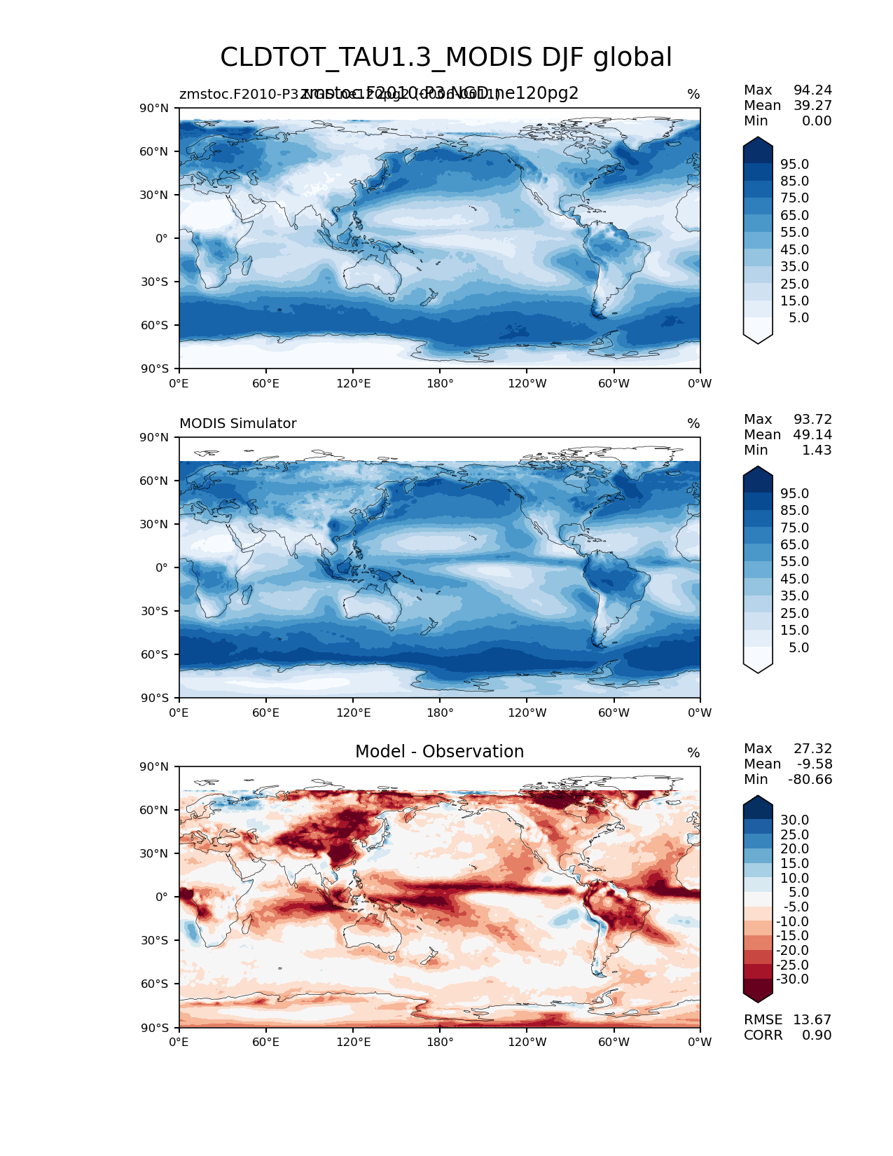 Use this command to recreate this image: | e3sm_diags lat_lon --no_viewer --case_id 'Cloud MODIS' --sets 'lat_lon' --run_type 'model_vs_obs' --variables 'CLDTOT_TAU1.3_MODIS' --seasons 'DJF' --regions 'global' --regrid_tool 'esmf' --regrid_method 'conservative' --main_title 'CLDTOT_TAU1.3_MODIS DJF global' --backend 'mpl' --output_format 'png' --canvas_size_w '1212' --canvas_size_h '1628' --figsize '8.5' '11.0' --dpi '150' --arrows --contour_levels '5' '15' '25' '35' '45' '55' '65' '75' '85' '95' --test_name 'zmstoc.F2010-P3.NGD.ne120pg2' --test_title 'zmstoc.F2010-P3.NGD.ne120pg2' --test_colormap 'Blues' --ref_name 'MODISCOSP' --reference_name 'MODIS Simulator' --reference_colormap 'Blues' --diff_title 'Model - Observation' --diff_colormap 'RdBu' --diff_levels '-30' '-25' '-20' '-15' '-10' '-5' '5' '10' '15' '20' '25' '30' --num_workers '4' --granulate 'variables' 'seasons' 'plevs' 'regions' --selectors 'sets' 'seasons' --reference_data_path '/global/cfs/cdirs/e3sm/acme_diags/obs_for_e3sm_diags/climatology/' --test_data_path '/global/cscratch1/sd/xsongsio/E3SM_simulations/zmstoc.F2010-P3.NGD.ne120pg2/diag/clim_rgr/6yr/' --results_dir '/global/cfs/cdirs/e3sm/www/xsongsio/zmstoc.F2010-P3.NGD.ne120pg2/6yr' |