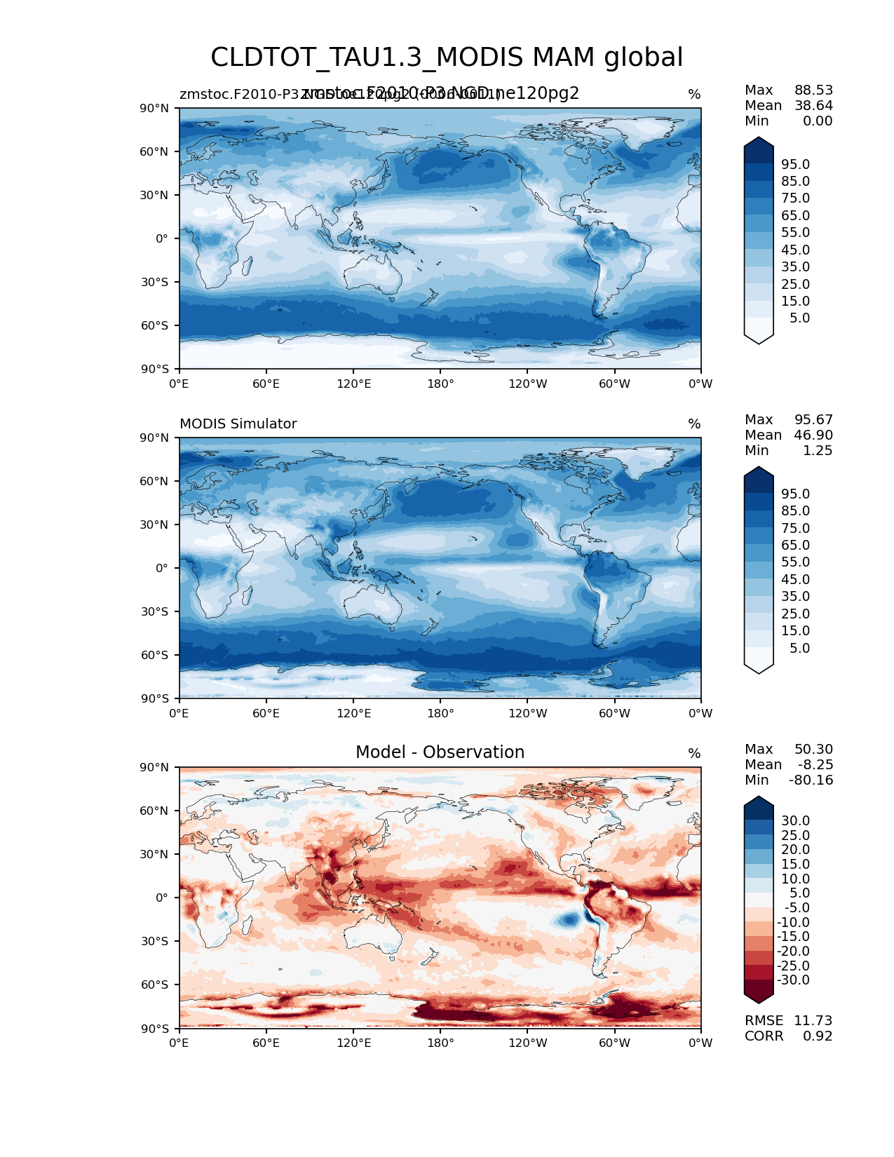 Use this command to recreate this image: | e3sm_diags lat_lon --no_viewer --case_id 'Cloud MODIS' --sets 'lat_lon' --run_type 'model_vs_obs' --variables 'CLDTOT_TAU1.3_MODIS' --seasons 'MAM' --regions 'global' --regrid_tool 'esmf' --regrid_method 'conservative' --main_title 'CLDTOT_TAU1.3_MODIS MAM global' --backend 'mpl' --output_format 'png' --canvas_size_w '1212' --canvas_size_h '1628' --figsize '8.5' '11.0' --dpi '150' --arrows --contour_levels '5' '15' '25' '35' '45' '55' '65' '75' '85' '95' --test_name 'zmstoc.F2010-P3.NGD.ne120pg2' --test_title 'zmstoc.F2010-P3.NGD.ne120pg2' --test_colormap 'Blues' --ref_name 'MODISCOSP' --reference_name 'MODIS Simulator' --reference_colormap 'Blues' --diff_title 'Model - Observation' --diff_colormap 'RdBu' --diff_levels '-30' '-25' '-20' '-15' '-10' '-5' '5' '10' '15' '20' '25' '30' --num_workers '4' --granulate 'variables' 'seasons' 'plevs' 'regions' --selectors 'sets' 'seasons' --reference_data_path '/global/cfs/cdirs/e3sm/acme_diags/obs_for_e3sm_diags/climatology/' --test_data_path '/global/cscratch1/sd/xsongsio/E3SM_simulations/zmstoc.F2010-P3.NGD.ne120pg2/diag/clim_rgr/6yr/' --results_dir '/global/cfs/cdirs/e3sm/www/xsongsio/zmstoc.F2010-P3.NGD.ne120pg2/6yr' |