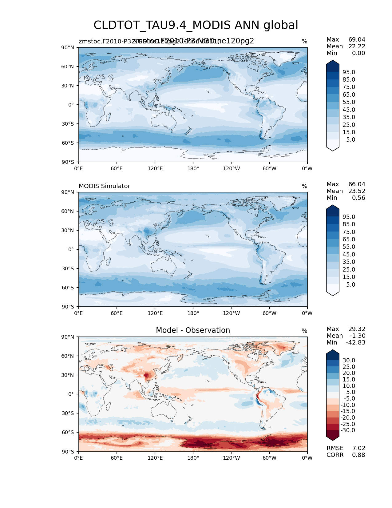 Use this command to recreate this image: | e3sm_diags lat_lon --no_viewer --case_id 'Cloud MODIS' --sets 'lat_lon' --run_type 'model_vs_obs' --variables 'CLDTOT_TAU9.4_MODIS' --seasons 'ANN' --regions 'global' --regrid_tool 'esmf' --regrid_method 'conservative' --main_title 'CLDTOT_TAU9.4_MODIS ANN global' --backend 'mpl' --output_format 'png' --canvas_size_w '1212' --canvas_size_h '1628' --figsize '8.5' '11.0' --dpi '150' --arrows --contour_levels '5' '15' '25' '35' '45' '55' '65' '75' '85' '95' --test_name 'zmstoc.F2010-P3.NGD.ne120pg2' --test_title 'zmstoc.F2010-P3.NGD.ne120pg2' --test_colormap 'Blues' --ref_name 'MODISCOSP' --reference_name 'MODIS Simulator' --reference_colormap 'Blues' --diff_title 'Model - Observation' --diff_colormap 'RdBu' --diff_levels '-30' '-25' '-20' '-15' '-10' '-5' '5' '10' '15' '20' '25' '30' --num_workers '4' --granulate 'variables' 'seasons' 'plevs' 'regions' --selectors 'sets' 'seasons' --reference_data_path '/global/cfs/cdirs/e3sm/acme_diags/obs_for_e3sm_diags/climatology/' --test_data_path '/global/cscratch1/sd/xsongsio/E3SM_simulations/zmstoc.F2010-P3.NGD.ne120pg2/diag/clim_rgr/6yr/' --results_dir '/global/cfs/cdirs/e3sm/www/xsongsio/zmstoc.F2010-P3.NGD.ne120pg2/6yr' |