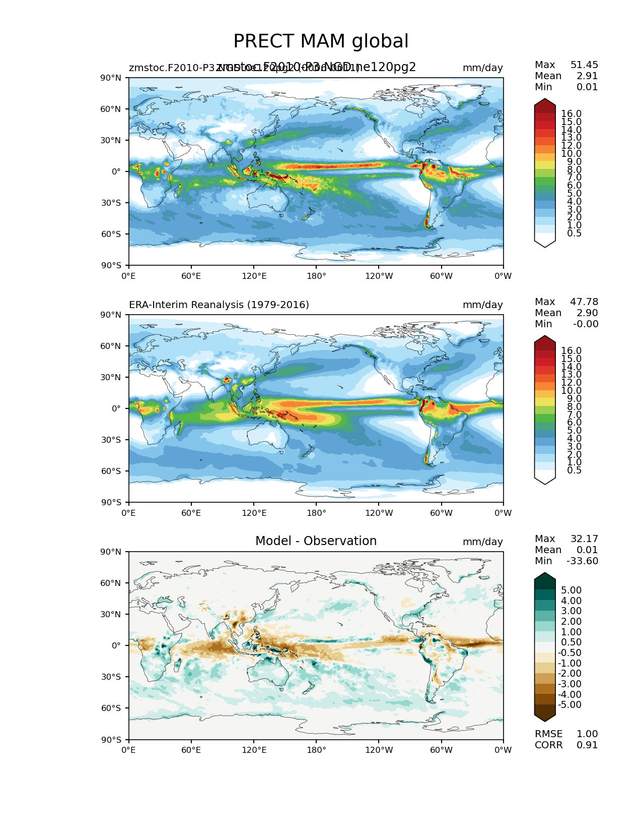 Use this command to recreate this image: | e3sm_diags lat_lon --no_viewer --case_id 'ERA-Interim' --sets 'lat_lon' --run_type 'model_vs_obs' --variables 'PRECT' --seasons 'MAM' --regions 'global' --regrid_tool 'esmf' --regrid_method 'conservative' --main_title 'PRECT MAM global' --backend 'mpl' --output_format 'png' --canvas_size_w '1212' --canvas_size_h '1628' --figsize '8.5' '11.0' --dpi '150' --arrows --contour_levels '0.5' '1' '2' '3' '4' '5' '6' '7' '8' '9' '10' '12' '13' '14' '15' '16' --test_name 'zmstoc.F2010-P3.NGD.ne120pg2' --test_title 'zmstoc.F2010-P3.NGD.ne120pg2' --test_colormap 'WhiteBlueGreenYellowRed.rgb' --ref_name 'ERA-Interim' --reference_name 'ERA-Interim Reanalysis' --reference_colormap 'WhiteBlueGreenYellowRed.rgb' --diff_title 'Model - Observation' --diff_colormap 'BrBG' --diff_levels '-5' '-4' '-3' '-2' '-1' '-0.5' '0.5' '1' '2' '3' '4' '5' --num_workers '4' --granulate 'variables' 'seasons' 'plevs' 'regions' --selectors 'sets' 'seasons' --reference_data_path '/global/cfs/cdirs/e3sm/acme_diags/obs_for_e3sm_diags/climatology/' --test_data_path '/global/cscratch1/sd/xsongsio/E3SM_simulations/zmstoc.F2010-P3.NGD.ne120pg2/diag/clim_rgr/6yr/' --results_dir '/global/cfs/cdirs/e3sm/www/xsongsio/zmstoc.F2010-P3.NGD.ne120pg2/6yr' |
