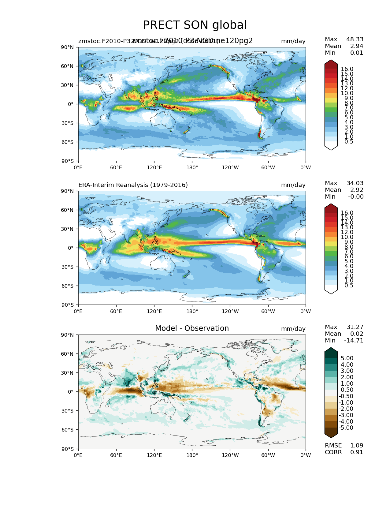 Use this command to recreate this image: | e3sm_diags lat_lon --no_viewer --case_id 'ERA-Interim' --sets 'lat_lon' --run_type 'model_vs_obs' --variables 'PRECT' --seasons 'SON' --regions 'global' --regrid_tool 'esmf' --regrid_method 'conservative' --main_title 'PRECT SON global' --backend 'mpl' --output_format 'png' --canvas_size_w '1212' --canvas_size_h '1628' --figsize '8.5' '11.0' --dpi '150' --arrows --contour_levels '0.5' '1' '2' '3' '4' '5' '6' '7' '8' '9' '10' '12' '13' '14' '15' '16' --test_name 'zmstoc.F2010-P3.NGD.ne120pg2' --test_title 'zmstoc.F2010-P3.NGD.ne120pg2' --test_colormap 'WhiteBlueGreenYellowRed.rgb' --ref_name 'ERA-Interim' --reference_name 'ERA-Interim Reanalysis' --reference_colormap 'WhiteBlueGreenYellowRed.rgb' --diff_title 'Model - Observation' --diff_colormap 'BrBG' --diff_levels '-5' '-4' '-3' '-2' '-1' '-0.5' '0.5' '1' '2' '3' '4' '5' --num_workers '4' --granulate 'variables' 'seasons' 'plevs' 'regions' --selectors 'sets' 'seasons' --reference_data_path '/global/cfs/cdirs/e3sm/acme_diags/obs_for_e3sm_diags/climatology/' --test_data_path '/global/cscratch1/sd/xsongsio/E3SM_simulations/zmstoc.F2010-P3.NGD.ne120pg2/diag/clim_rgr/6yr/' --results_dir '/global/cfs/cdirs/e3sm/www/xsongsio/zmstoc.F2010-P3.NGD.ne120pg2/6yr' |