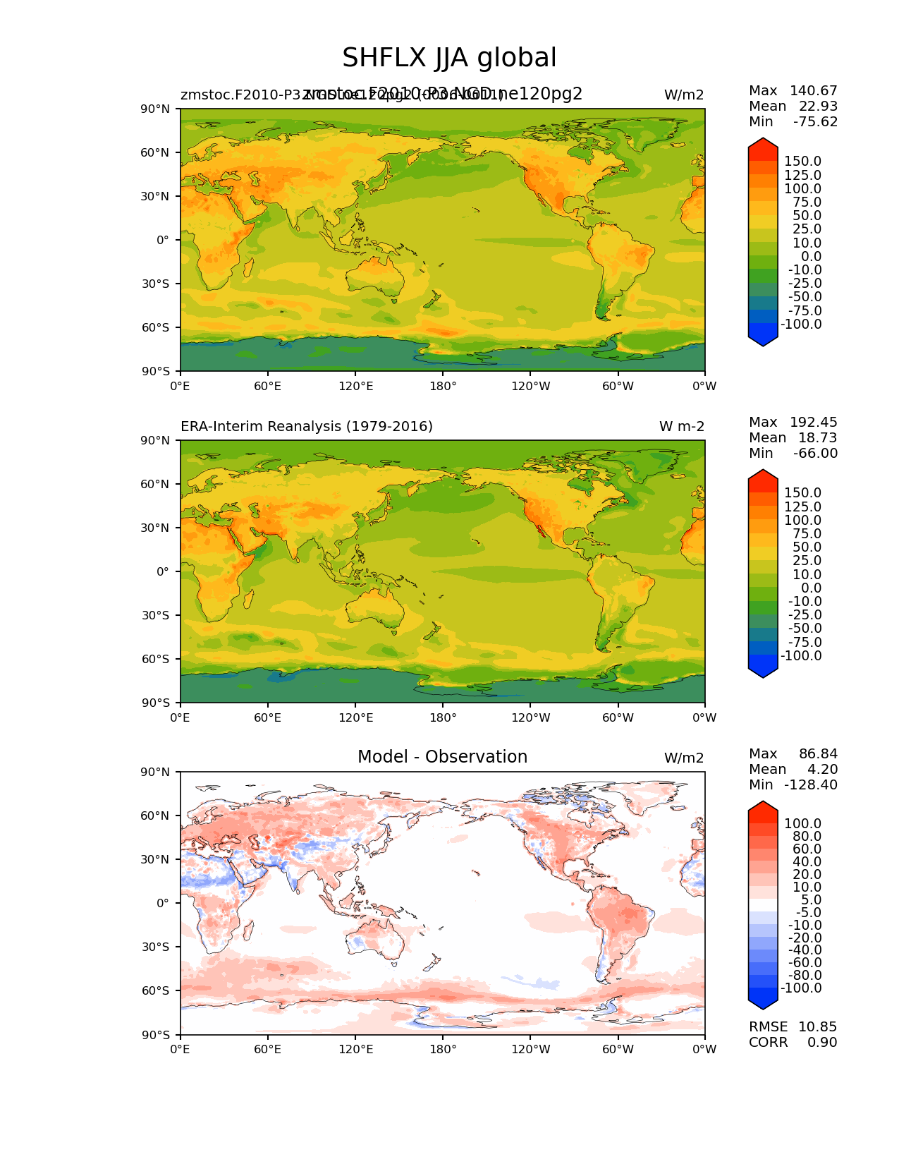 Use this command to recreate this image: | e3sm_diags lat_lon --no_viewer --case_id 'ERA-Interim' --sets 'lat_lon' --run_type 'model_vs_obs' --variables 'SHFLX' --seasons 'JJA' --regions 'global' --regrid_tool 'esmf' --regrid_method 'conservative' --main_title 'SHFLX JJA global' --backend 'mpl' --output_format 'png' --canvas_size_w '1212' --canvas_size_h '1628' --figsize '8.5' '11.0' --dpi '150' --arrows --contour_levels '-100' '-75' '-50' '-25' '-10' '0' '10' '25' '50' '75' '100' '125' '150' --test_name 'zmstoc.F2010-P3.NGD.ne120pg2' --test_title 'zmstoc.F2010-P3.NGD.ne120pg2' --test_colormap 'cet_rainbow.rgb' --ref_name 'ERA-Interim' --reference_name 'ERA-Interim Reanalysis' --reference_colormap 'cet_rainbow.rgb' --diff_title 'Model - Observation' --diff_colormap 'diverging_bwr.rgb' --diff_levels '-100' '-80' '-60' '-40' '-20' '-10' '-5' '5' '10' '20' '40' '60' '80' '100' --num_workers '4' --granulate 'variables' 'seasons' 'plevs' 'regions' --selectors 'sets' 'seasons' --reference_data_path '/global/cfs/cdirs/e3sm/acme_diags/obs_for_e3sm_diags/climatology/' --test_data_path '/global/cscratch1/sd/xsongsio/E3SM_simulations/zmstoc.F2010-P3.NGD.ne120pg2/diag/clim_rgr/6yr/' --results_dir '/global/cfs/cdirs/e3sm/www/xsongsio/zmstoc.F2010-P3.NGD.ne120pg2/6yr' |