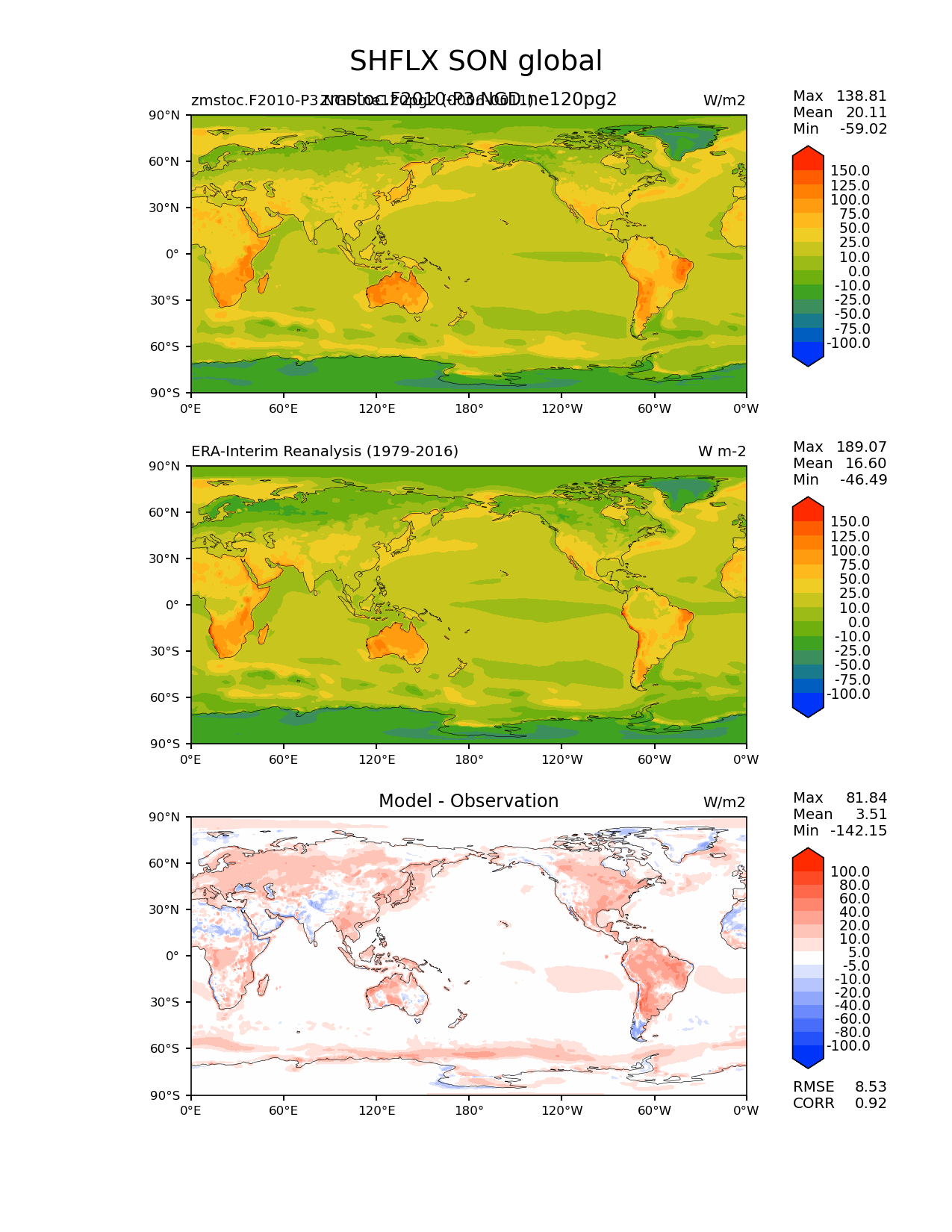 Use this command to recreate this image: | e3sm_diags lat_lon --no_viewer --case_id 'ERA-Interim' --sets 'lat_lon' --run_type 'model_vs_obs' --variables 'SHFLX' --seasons 'SON' --regions 'global' --regrid_tool 'esmf' --regrid_method 'conservative' --main_title 'SHFLX SON global' --backend 'mpl' --output_format 'png' --canvas_size_w '1212' --canvas_size_h '1628' --figsize '8.5' '11.0' --dpi '150' --arrows --contour_levels '-100' '-75' '-50' '-25' '-10' '0' '10' '25' '50' '75' '100' '125' '150' --test_name 'zmstoc.F2010-P3.NGD.ne120pg2' --test_title 'zmstoc.F2010-P3.NGD.ne120pg2' --test_colormap 'cet_rainbow.rgb' --ref_name 'ERA-Interim' --reference_name 'ERA-Interim Reanalysis' --reference_colormap 'cet_rainbow.rgb' --diff_title 'Model - Observation' --diff_colormap 'diverging_bwr.rgb' --diff_levels '-100' '-80' '-60' '-40' '-20' '-10' '-5' '5' '10' '20' '40' '60' '80' '100' --num_workers '4' --granulate 'variables' 'seasons' 'plevs' 'regions' --selectors 'sets' 'seasons' --reference_data_path '/global/cfs/cdirs/e3sm/acme_diags/obs_for_e3sm_diags/climatology/' --test_data_path '/global/cscratch1/sd/xsongsio/E3SM_simulations/zmstoc.F2010-P3.NGD.ne120pg2/diag/clim_rgr/6yr/' --results_dir '/global/cfs/cdirs/e3sm/www/xsongsio/zmstoc.F2010-P3.NGD.ne120pg2/6yr' |