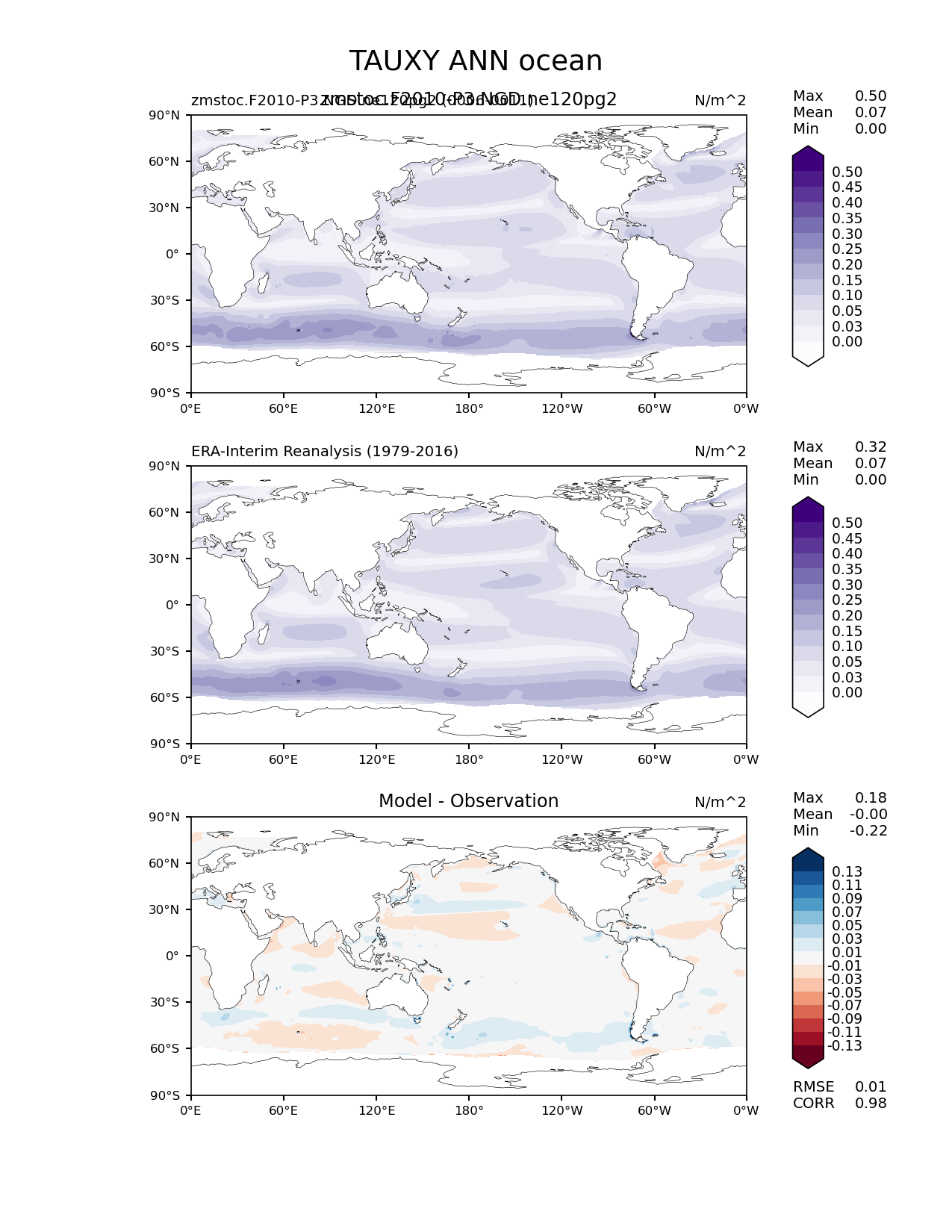 Use this command to recreate this image: | e3sm_diags lat_lon --no_viewer --case_id 'ERA-Interim' --sets 'lat_lon' --run_type 'model_vs_obs' --variables 'TAUXY' --seasons 'ANN' --regions 'ocean' --regrid_tool 'esmf' --regrid_method 'conservative' --main_title 'TAUXY ANN ocean' --backend 'mpl' --output_format 'png' --canvas_size_w '1212' --canvas_size_h '1628' --figsize '8.5' '11.0' --dpi '150' --arrows --contour_levels '0.0' '0.025' '0.05' '0.1' '0.15' '0.2' '0.25' '0.3' '0.35' '0.4' '0.45' '0.5' --test_name 'zmstoc.F2010-P3.NGD.ne120pg2' --test_title 'zmstoc.F2010-P3.NGD.ne120pg2' --test_colormap 'Purples' --ref_name 'ERA-Interim' --reference_name 'ERA-Interim Reanalysis' --reference_colormap 'Purples' --diff_title 'Model - Observation' --diff_colormap 'RdBu' --diff_levels '-0.13' '-0.11' '-0.09' '-0.07' '-0.05' '-0.03' '-0.01' '0.01' '0.03' '0.05' '0.07' '0.09' '0.11' '0.13' --num_workers '4' --granulate 'variables' 'seasons' 'plevs' 'regions' --selectors 'sets' 'seasons' --reference_data_path '/global/cfs/cdirs/e3sm/acme_diags/obs_for_e3sm_diags/climatology/' --test_data_path '/global/cscratch1/sd/xsongsio/E3SM_simulations/zmstoc.F2010-P3.NGD.ne120pg2/diag/clim_rgr/6yr/' --results_dir '/global/cfs/cdirs/e3sm/www/xsongsio/zmstoc.F2010-P3.NGD.ne120pg2/6yr' |