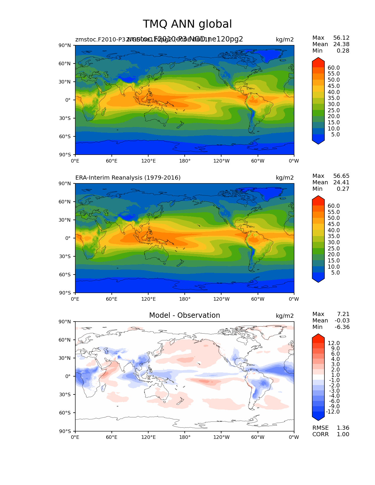Use this command to recreate this image: | e3sm_diags lat_lon --no_viewer --case_id 'ERA-Interim' --sets 'lat_lon' --run_type 'model_vs_obs' --variables 'TMQ' --seasons 'ANN' --regions 'global' --regrid_tool 'esmf' --regrid_method 'conservative' --main_title 'TMQ ANN global' --backend 'mpl' --output_format 'png' --canvas_size_w '1212' --canvas_size_h '1628' --figsize '8.5' '11.0' --dpi '150' --arrows --contour_levels '5' '10' '15' '20' '25' '30' '35' '40' '45' '50' '55' '60' --test_name 'zmstoc.F2010-P3.NGD.ne120pg2' --test_title 'zmstoc.F2010-P3.NGD.ne120pg2' --test_colormap 'cet_rainbow.rgb' --ref_name 'ERA-Interim' --reference_name 'ERA-Interim Reanalysis' --reference_colormap 'cet_rainbow.rgb' --diff_title 'Model - Observation' --diff_colormap 'diverging_bwr.rgb' --diff_levels '-12' '-9' '-6' '-4' '-3' '-2' '-1' '1' '2' '3' '4' '6' '9' '12' --num_workers '4' --granulate 'variables' 'seasons' 'plevs' 'regions' --selectors 'sets' 'seasons' --reference_data_path '/global/cfs/cdirs/e3sm/acme_diags/obs_for_e3sm_diags/climatology/' --test_data_path '/global/cscratch1/sd/xsongsio/E3SM_simulations/zmstoc.F2010-P3.NGD.ne120pg2/diag/clim_rgr/6yr/' --results_dir '/global/cfs/cdirs/e3sm/www/xsongsio/zmstoc.F2010-P3.NGD.ne120pg2/6yr' |