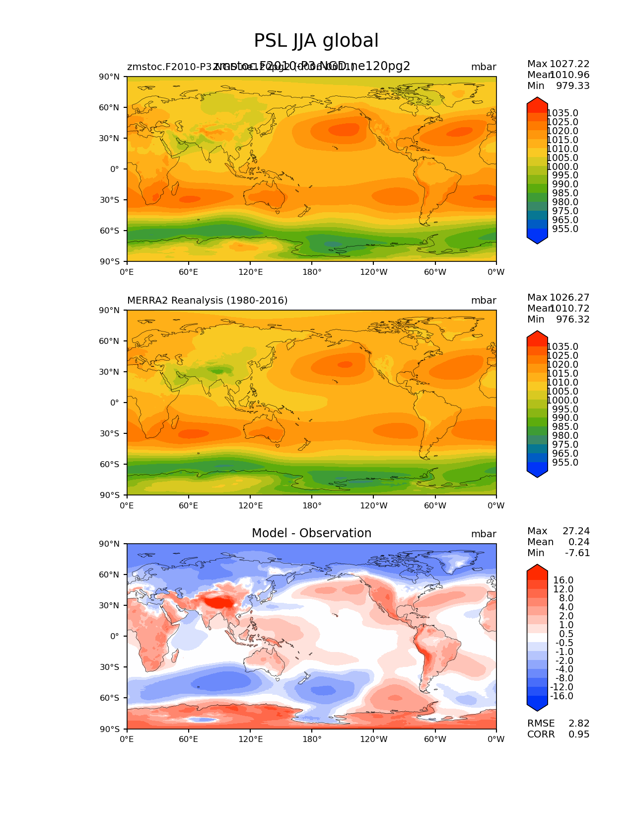 Use this command to recreate this image: | e3sm_diags lat_lon --no_viewer --case_id 'MERRA2' --sets 'lat_lon' --run_type 'model_vs_obs' --variables 'PSL' --seasons 'JJA' --regions 'global' --regrid_tool 'esmf' --regrid_method 'conservative' --main_title 'PSL JJA global' --backend 'mpl' --output_format 'png' --canvas_size_w '1212' --canvas_size_h '1628' --figsize '8.5' '11.0' --dpi '150' --arrows --contour_levels '955' '965' '975' '980' '985' '990' '995' '1000' '1005' '1010' '1015' '1020' '1025' '1035' --test_name 'zmstoc.F2010-P3.NGD.ne120pg2' --test_title 'zmstoc.F2010-P3.NGD.ne120pg2' --test_colormap 'cet_rainbow.rgb' --ref_name 'MERRA2' --reference_name 'MERRA2 Reanalysis' --reference_colormap 'cet_rainbow.rgb' --diff_title 'Model - Observation' --diff_colormap 'diverging_bwr.rgb' --diff_levels '-16' '-12' '-8' '-4' '-2' '-1' '-0.5' '0.5' '1' '2' '4' '8' '12' '16' --num_workers '4' --granulate 'variables' 'seasons' 'plevs' 'regions' --selectors 'sets' 'seasons' --reference_data_path '/global/cfs/cdirs/e3sm/acme_diags/obs_for_e3sm_diags/climatology/' --test_data_path '/global/cscratch1/sd/xsongsio/E3SM_simulations/zmstoc.F2010-P3.NGD.ne120pg2/diag/clim_rgr/6yr/' --results_dir '/global/cfs/cdirs/e3sm/www/xsongsio/zmstoc.F2010-P3.NGD.ne120pg2/6yr' |
